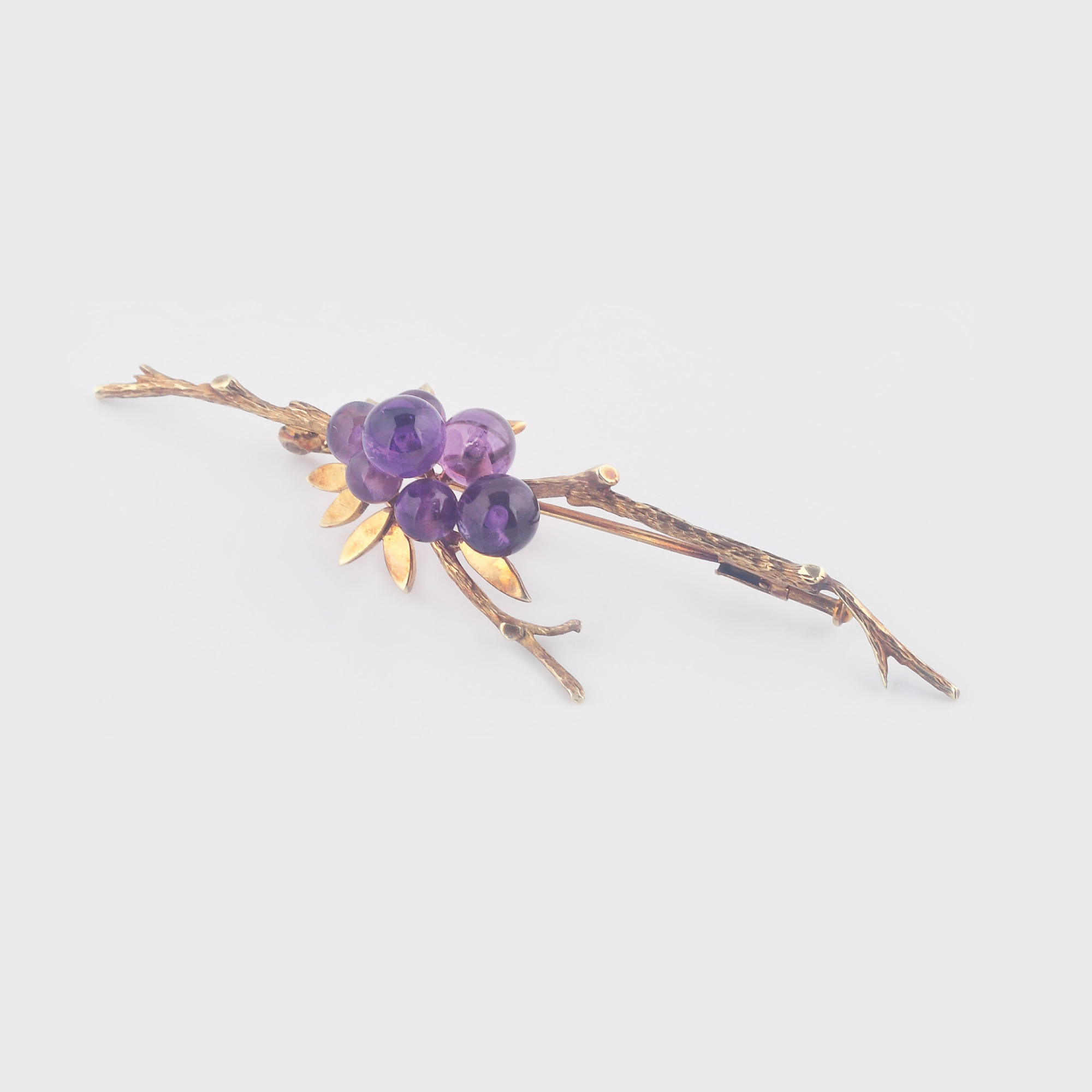 59. Delicată broșă din aur, ornată cu strugure de ametiste