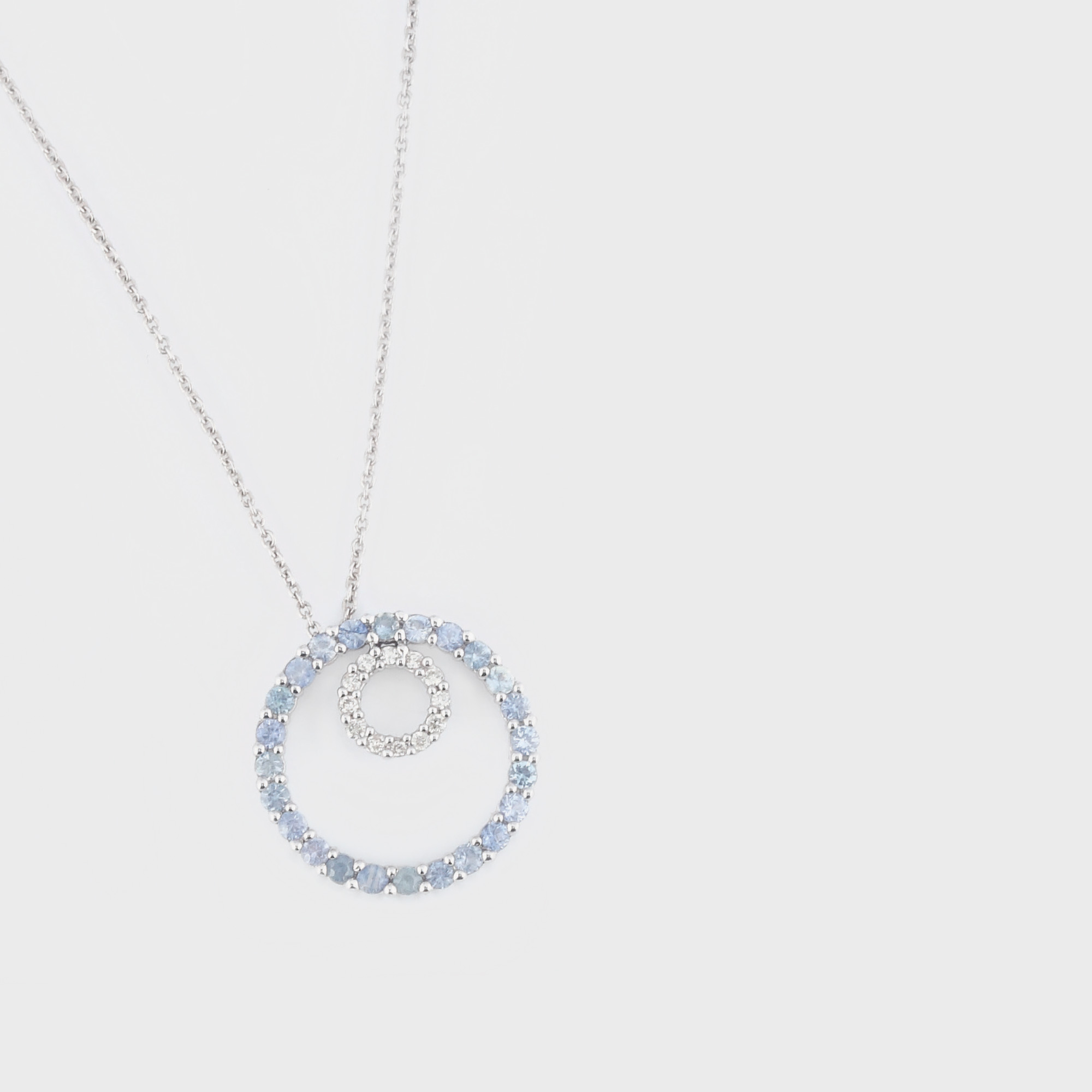 63. Lanţ cu pandantiv din aur alb, decorat cu diamante albe şi albastre