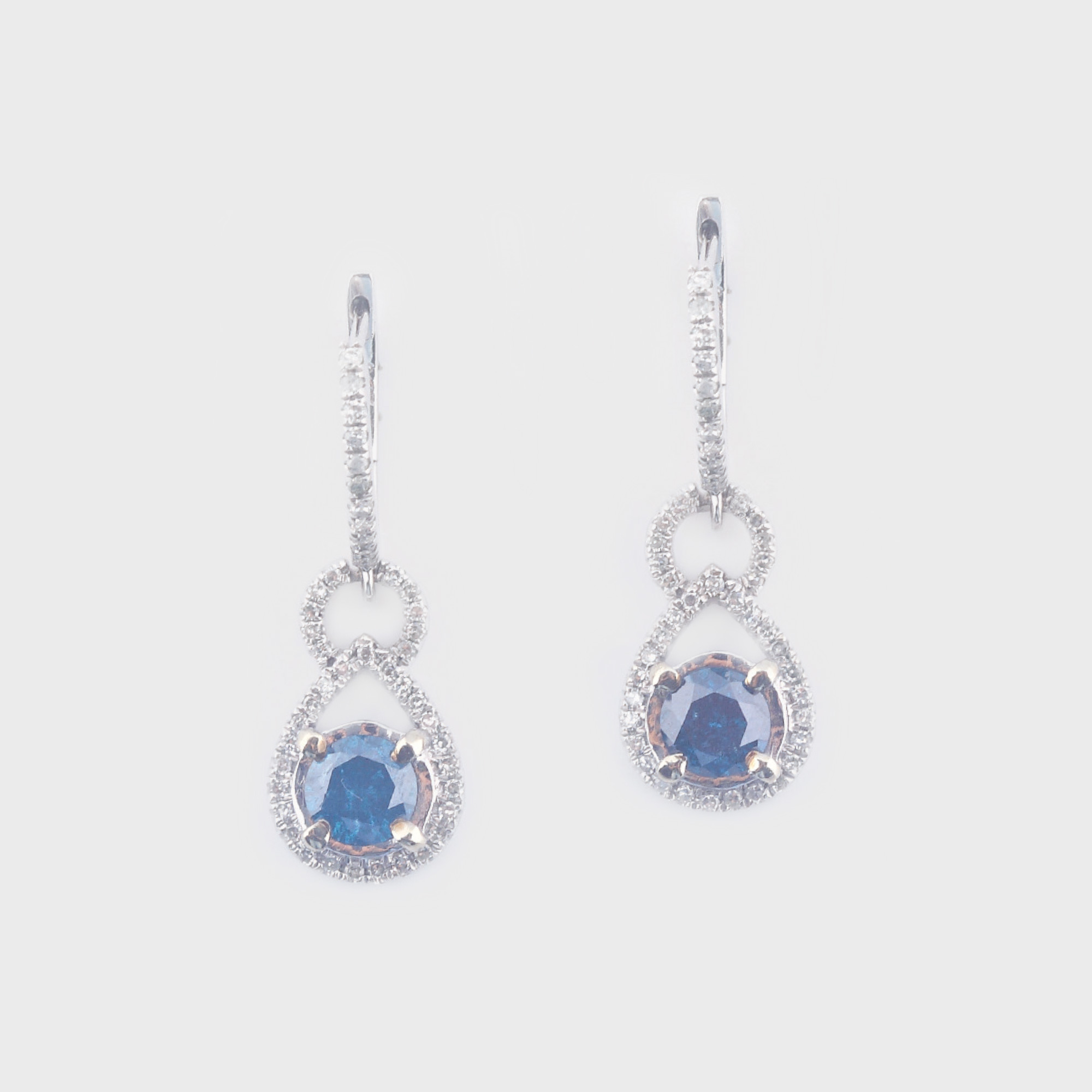 79. Interesantă pereche de cercei din aur alb, decorată cu diamante albe și albastre