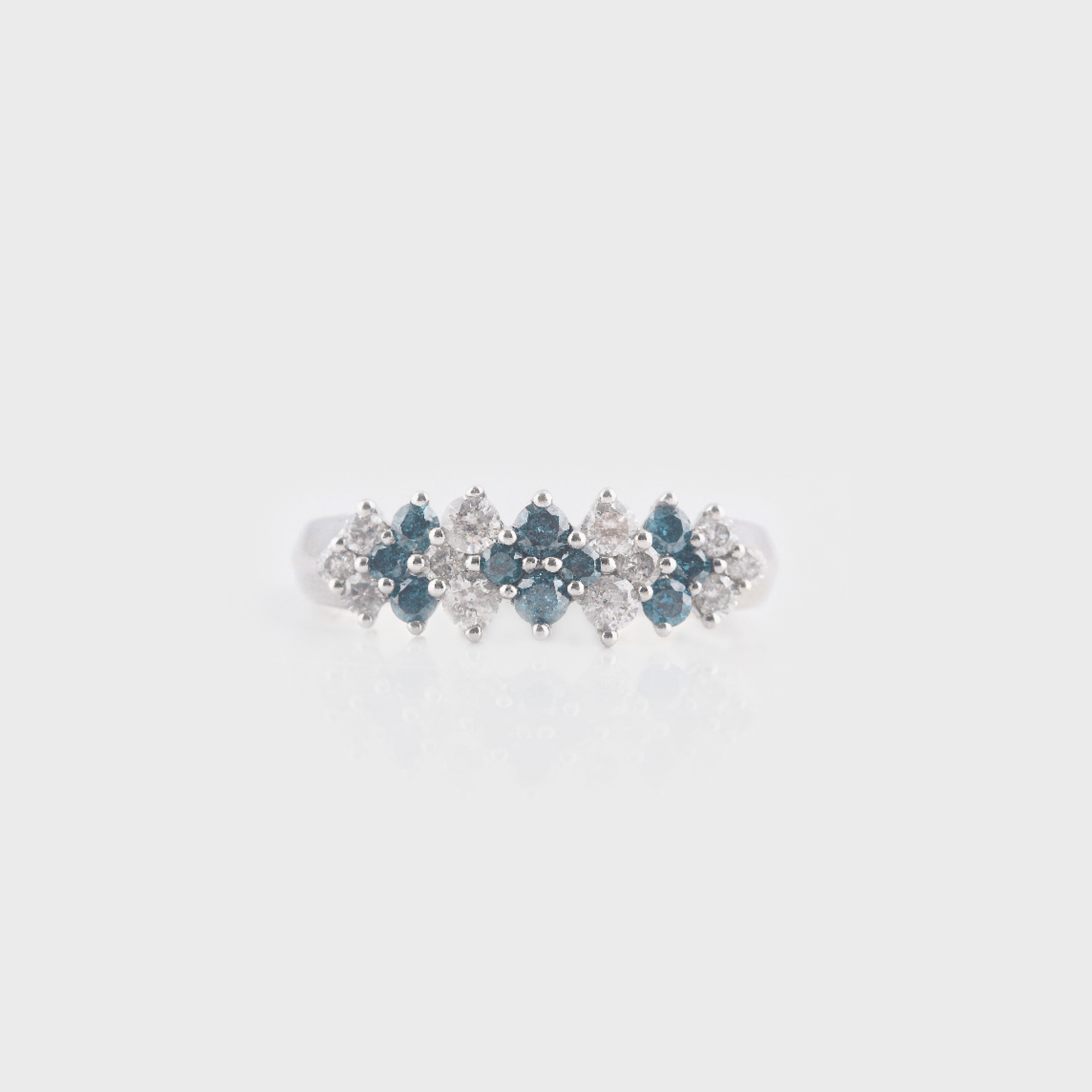 80. Inel din aur alb, decorat cu diamante albastre şi albe