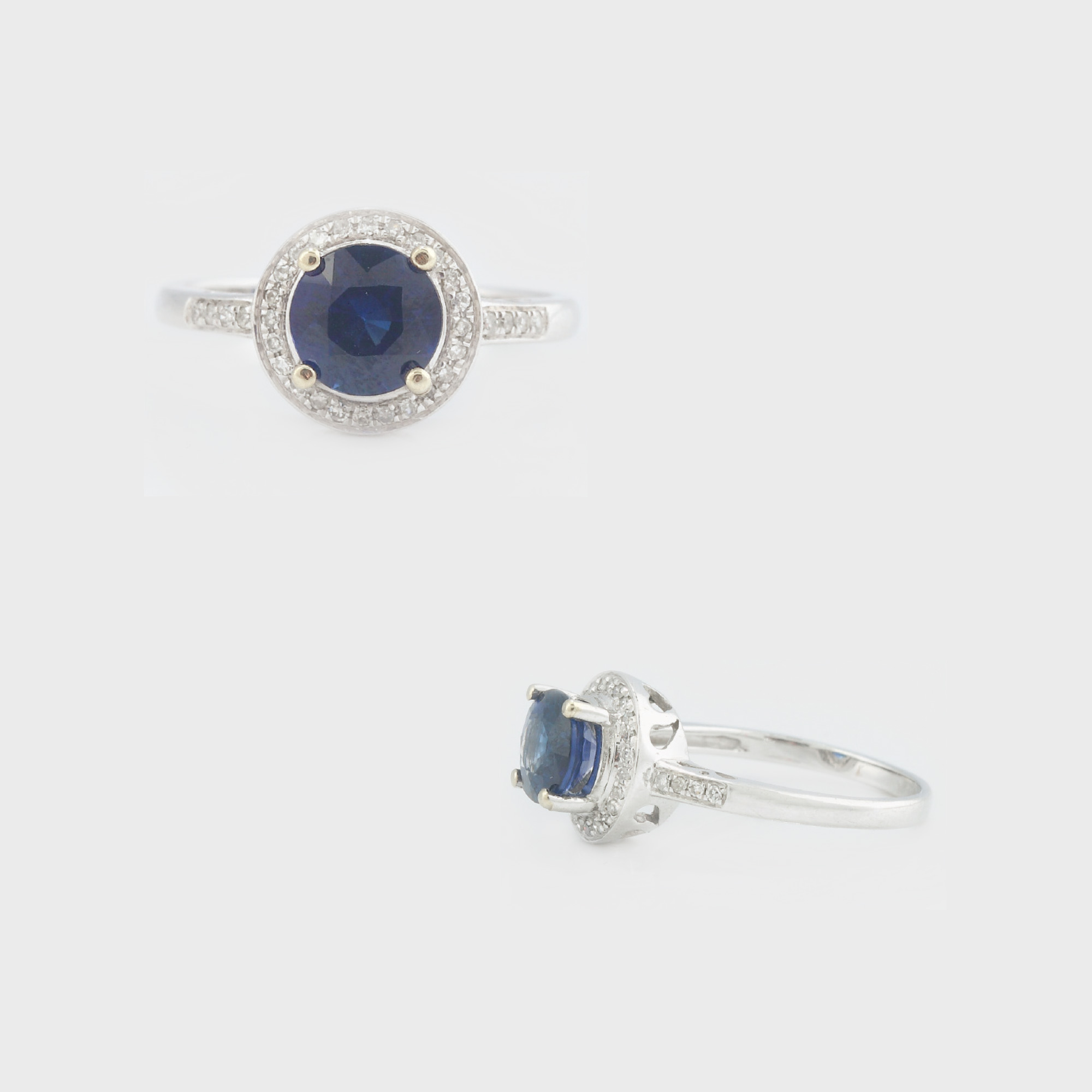 82. Inel din aur alb, decorat cu un frumos safir anturat de diamante