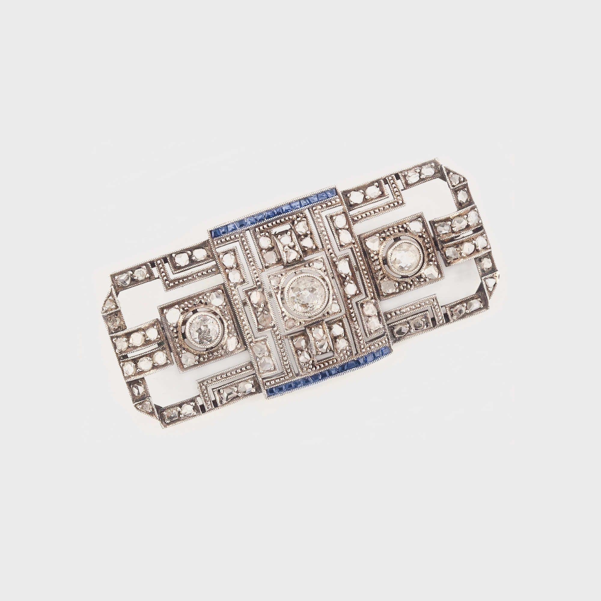 84. Broşă Art Deco din argint, decorată cu diamante şi safire