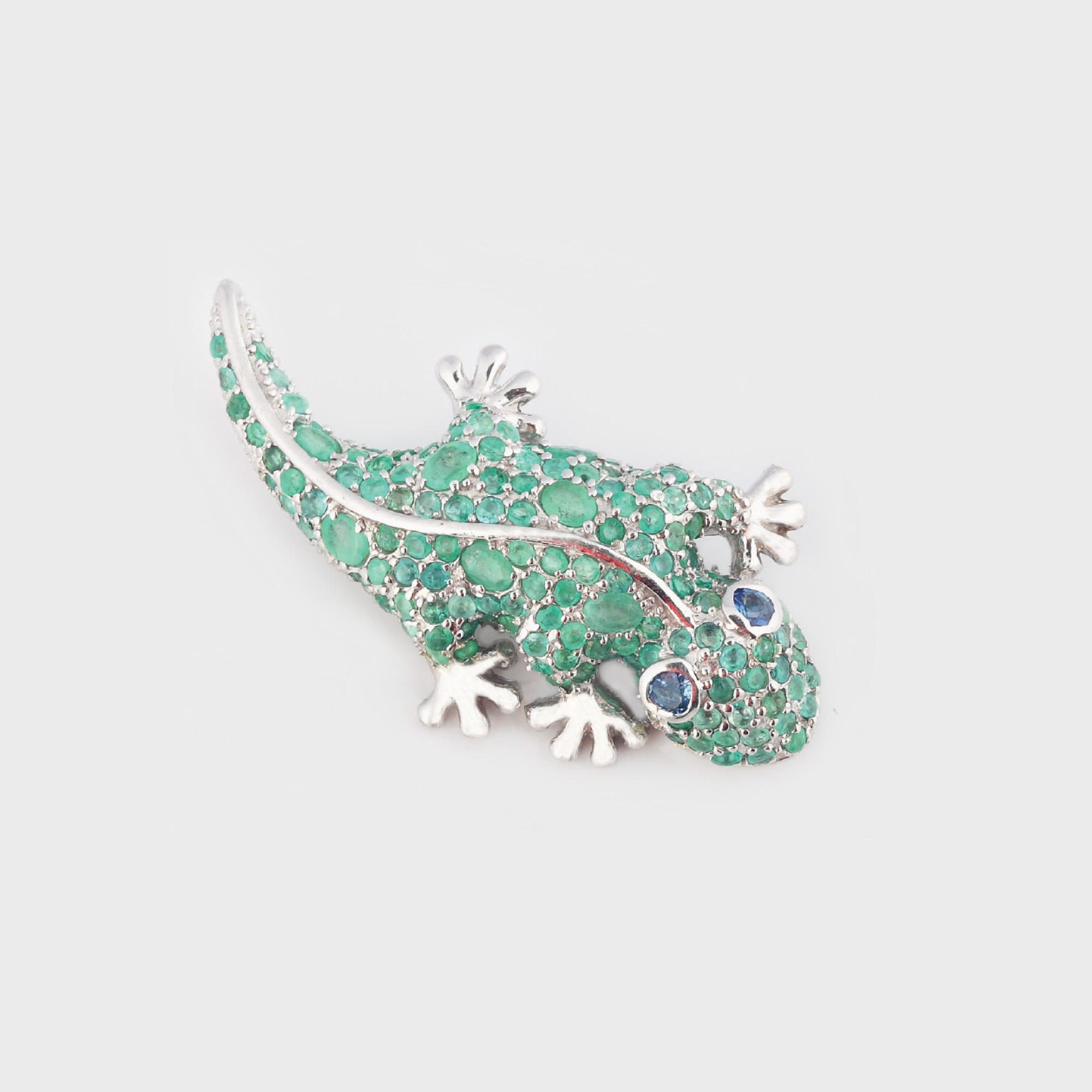 85. Broşă din argint, în formă de salamandră, amplu pavată cu smaralde şi safire