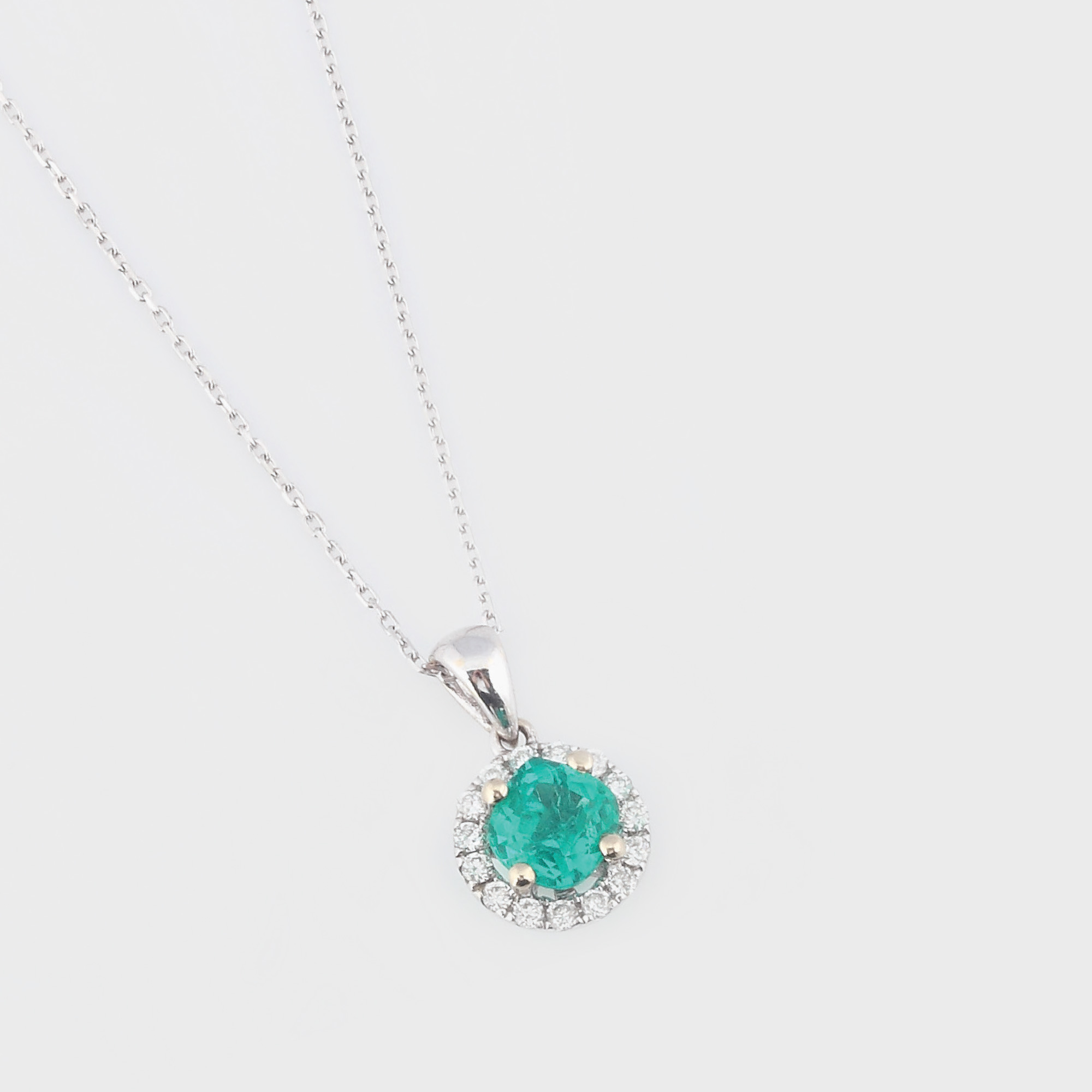 90. Delicat pandantiv din aur alb, ornamentat cu smarald anturat de diamante
