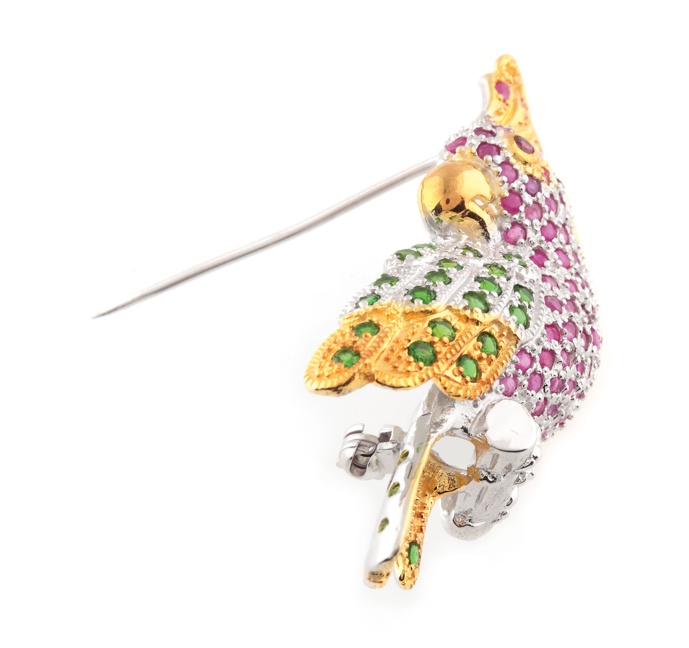 76. Broșă din argint aurit, sub formă de papagal, decorată cu pietre prețioase