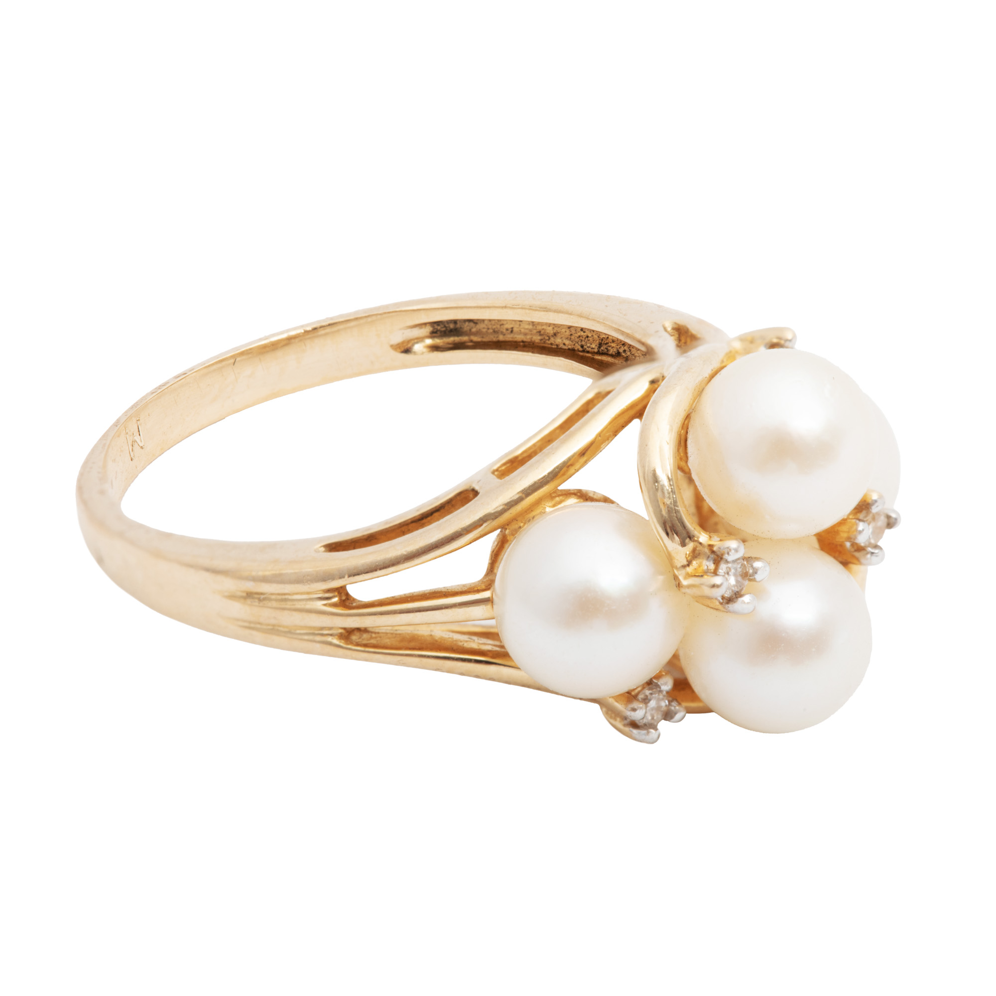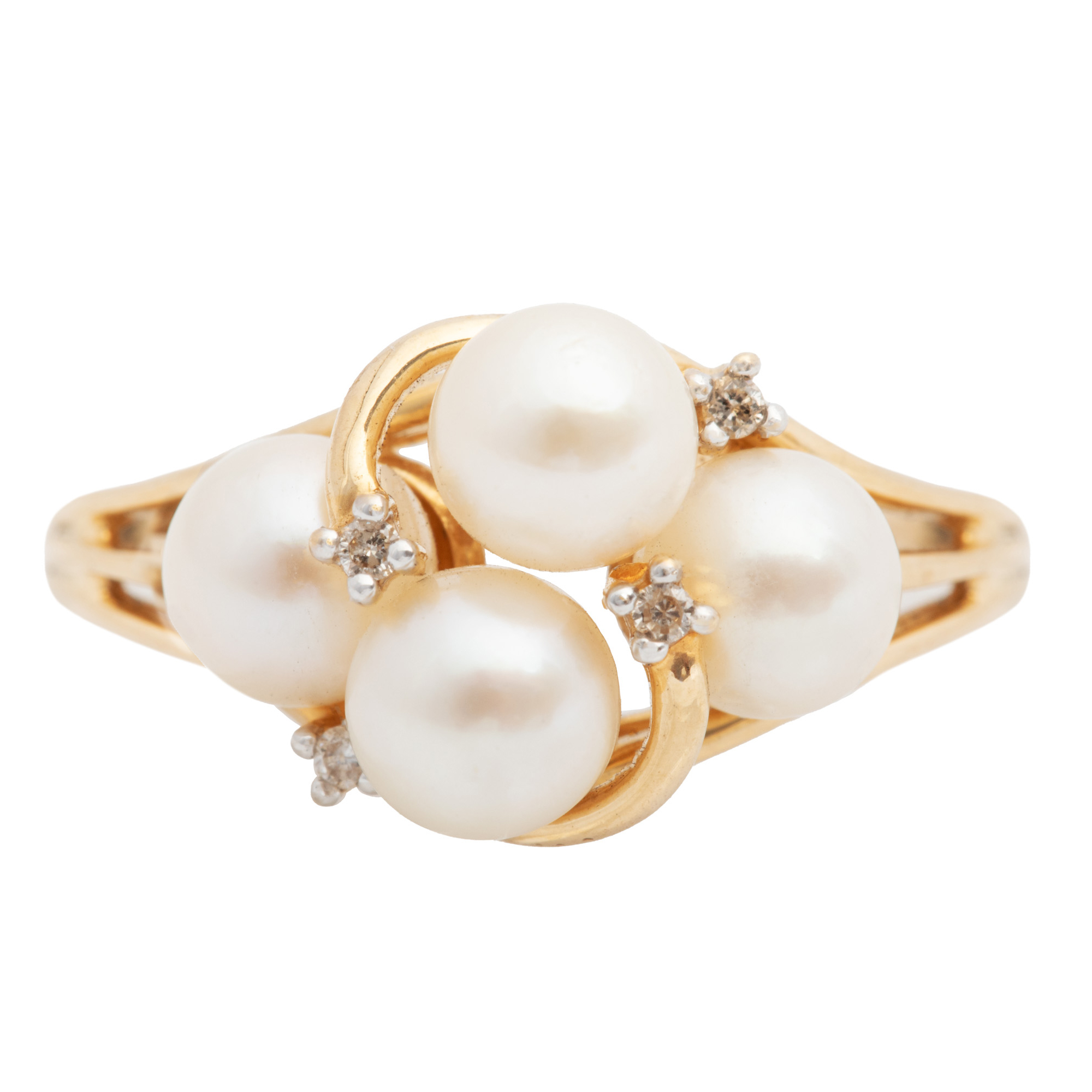 4 perle rotunde de cultură Akoya, culoare albă, cca. 5,41-5,61 mm.; 4 diamante rotunde briliant, culoare J-K, claritate SI2-I1, cca. 0,04 ct.