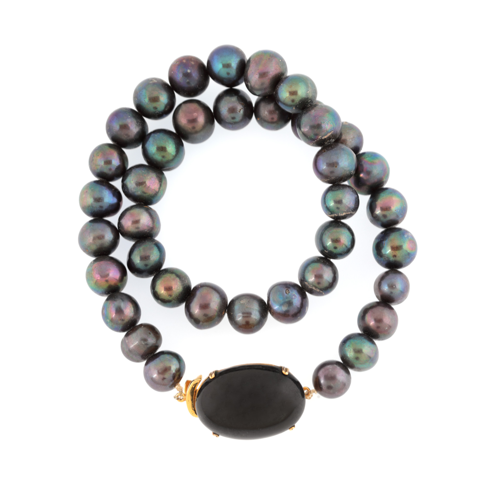 38 perle de cultură de apă dulce rotunde, culoare negru, d=9,91-12,33 mm și 1 black star diopsid oval caboșon, culoare negru, cca. 55 ct.
