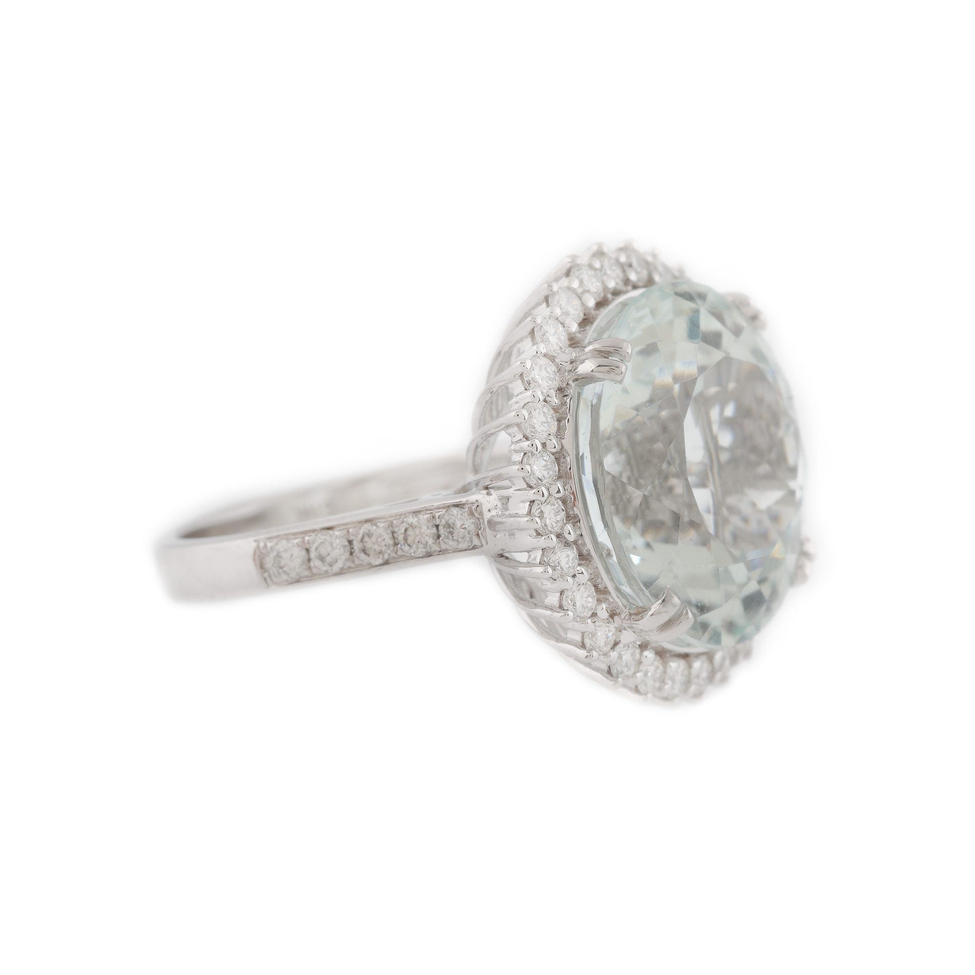 1 acvamarin rotund fațetat, culoare bleu, claritate eye-clean, cca. 12,05 ct. și 38 diamante rotunde briliant, culoare G-H, claritate VS, cca. 0,7 ct.