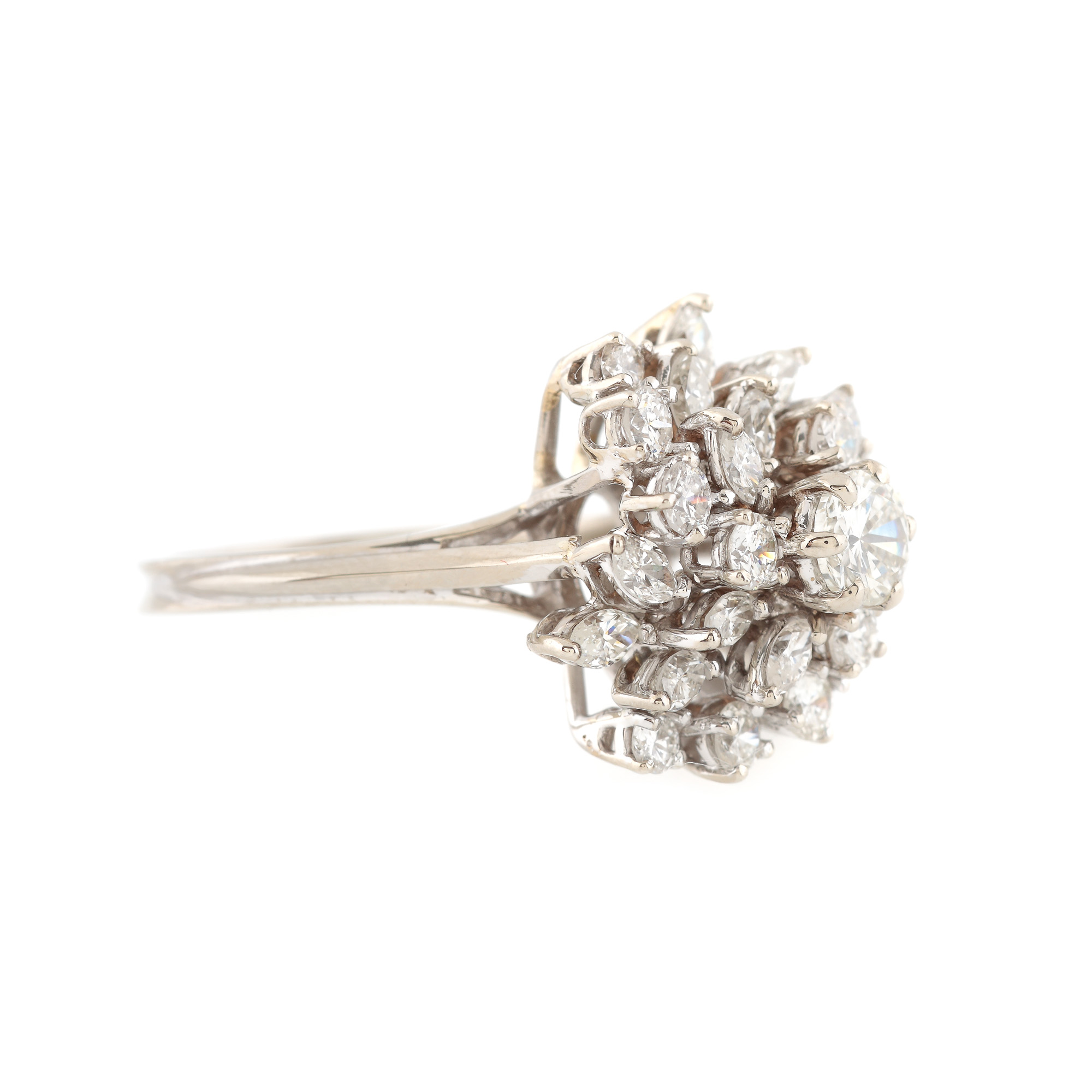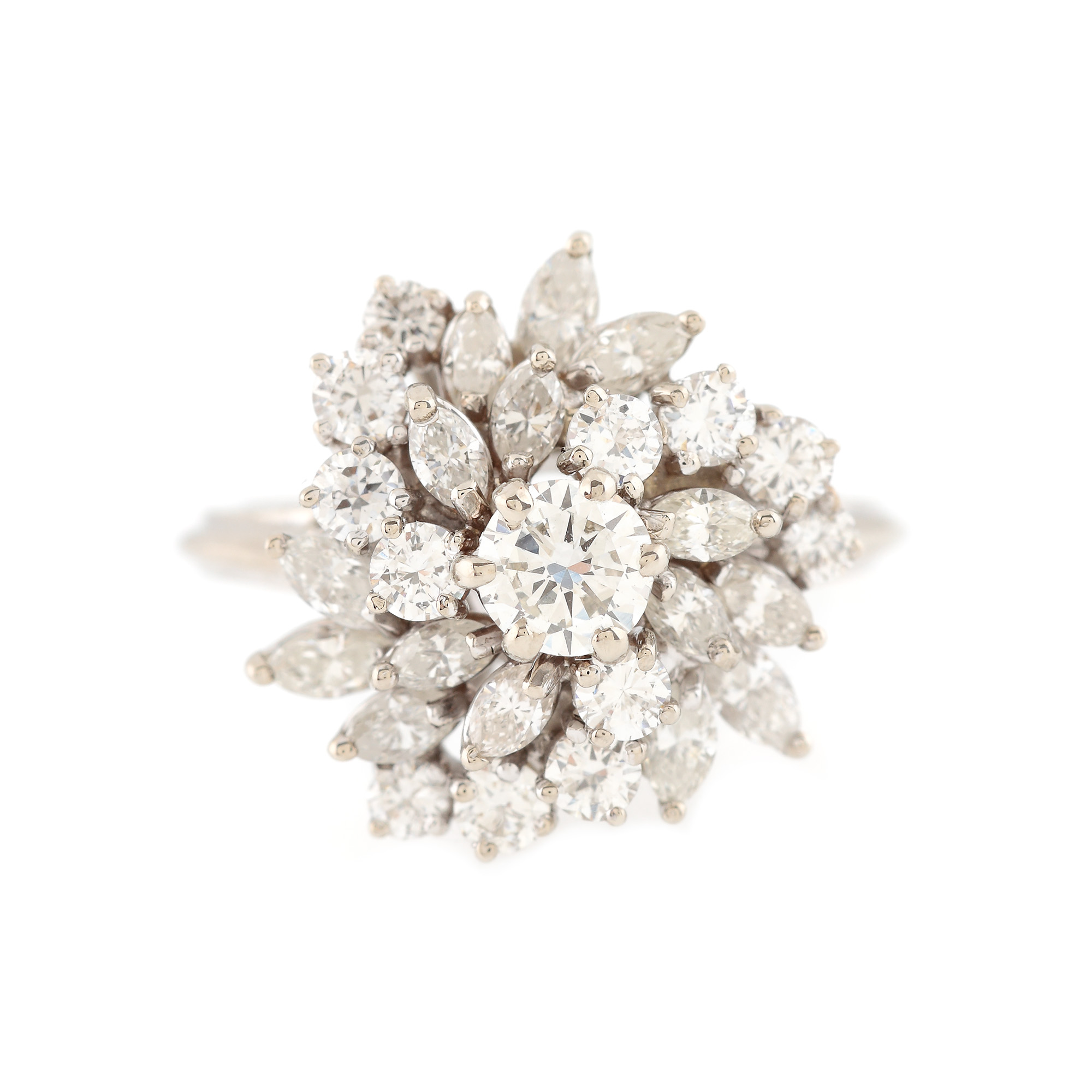 1 diamant rotund briliant, culoare I-J, claritate VS1, cca. 0,4 ct. și 27 diamante (12 rotunde briliant, 15 marchiz fațetate) culoare I-J, claritate VS-SI1, cca. 1,9 ct.