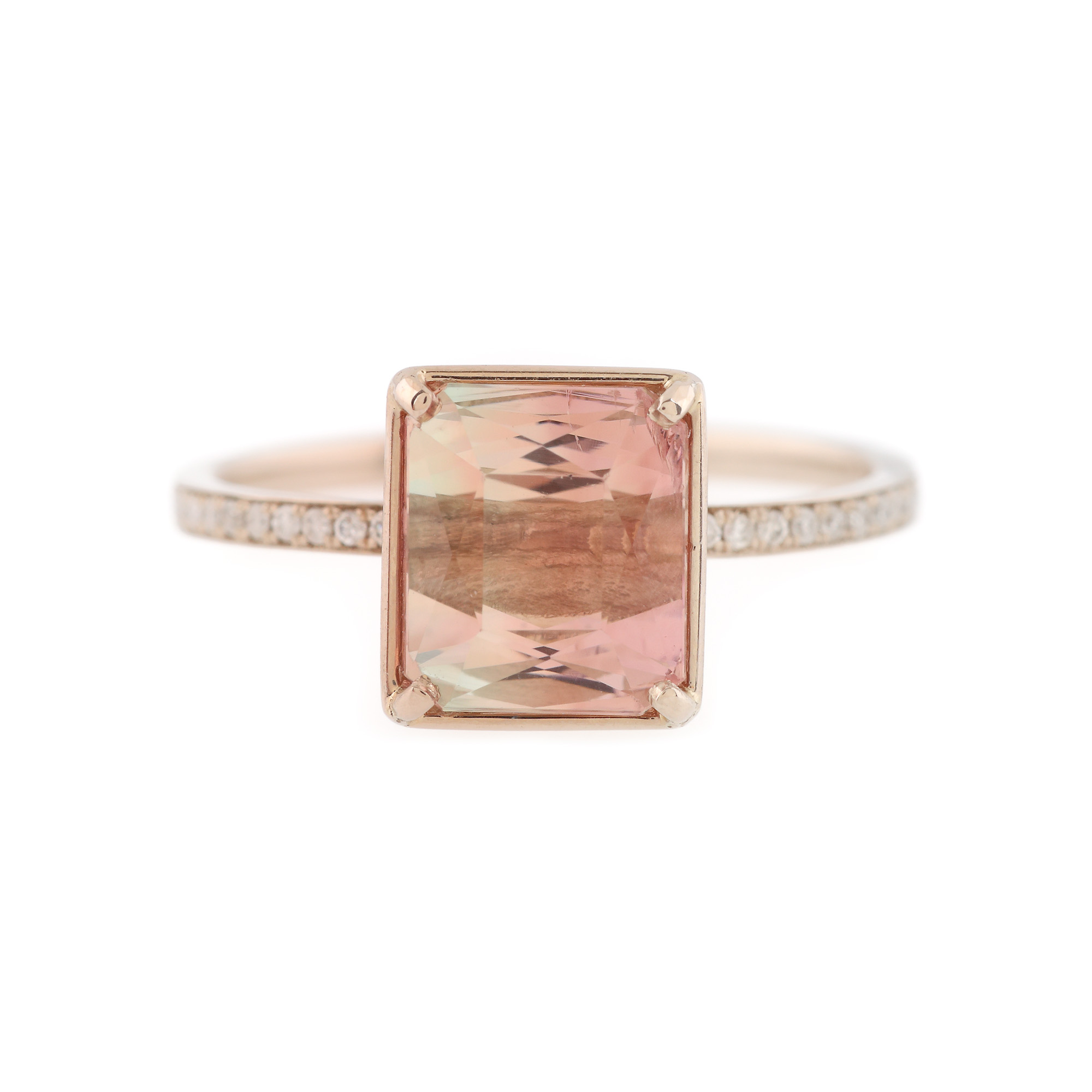 40 diamante rotunde briliant, culoare I-J, claritate SI-I1, cca. 0,12 ct. și 1 turmalină parti-colored rectangular fațetată, culoare roz și bleu, claritate eye-clean, cca. 2,3 ct.