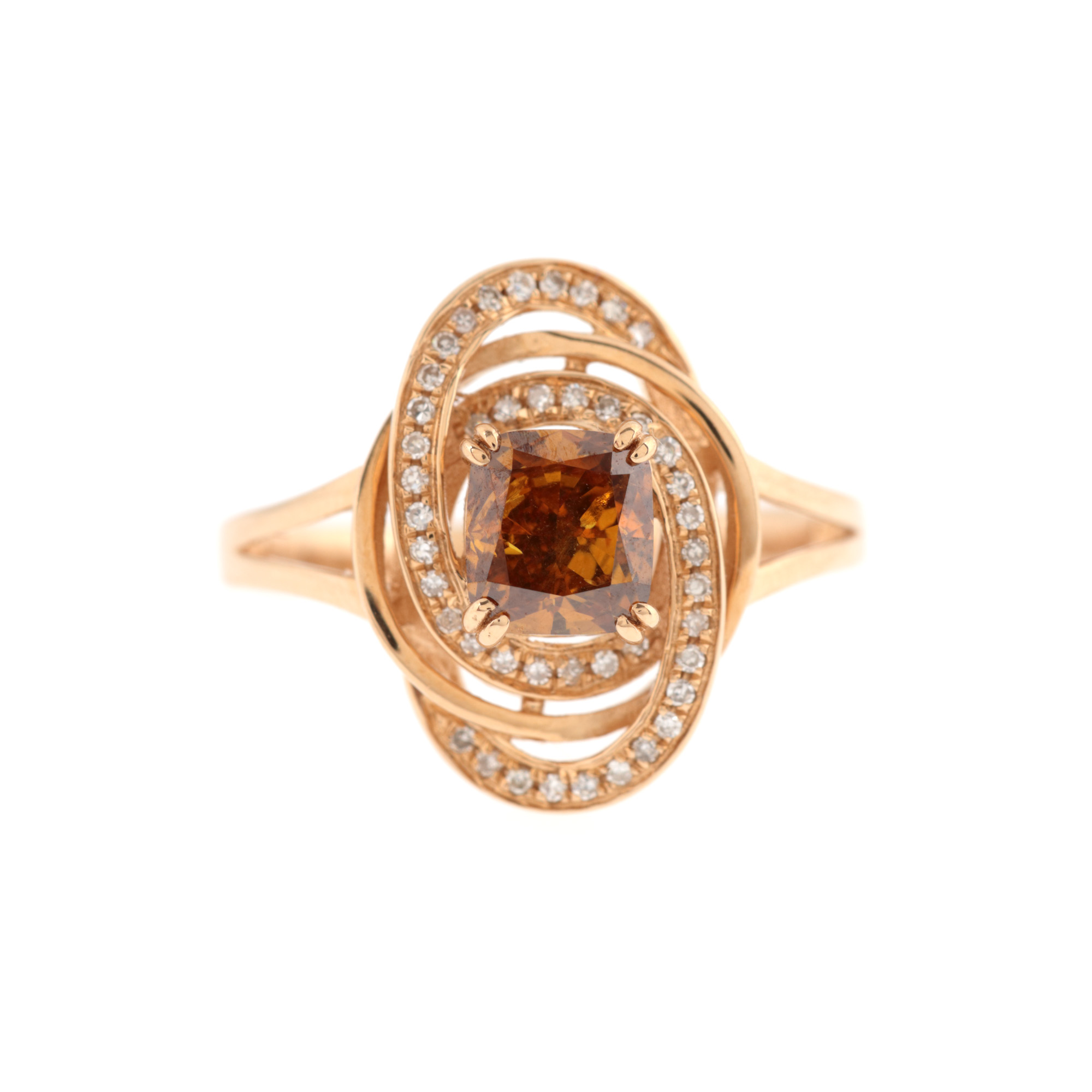 1 diamant pătrat cushion, culoare maro (fancy deep orangy yellow), claritate I1, cca. 1,05 ct. și 44 diamante single cut, culoare H-I, claritate VS-SI1, cca. 0,13 ct.
