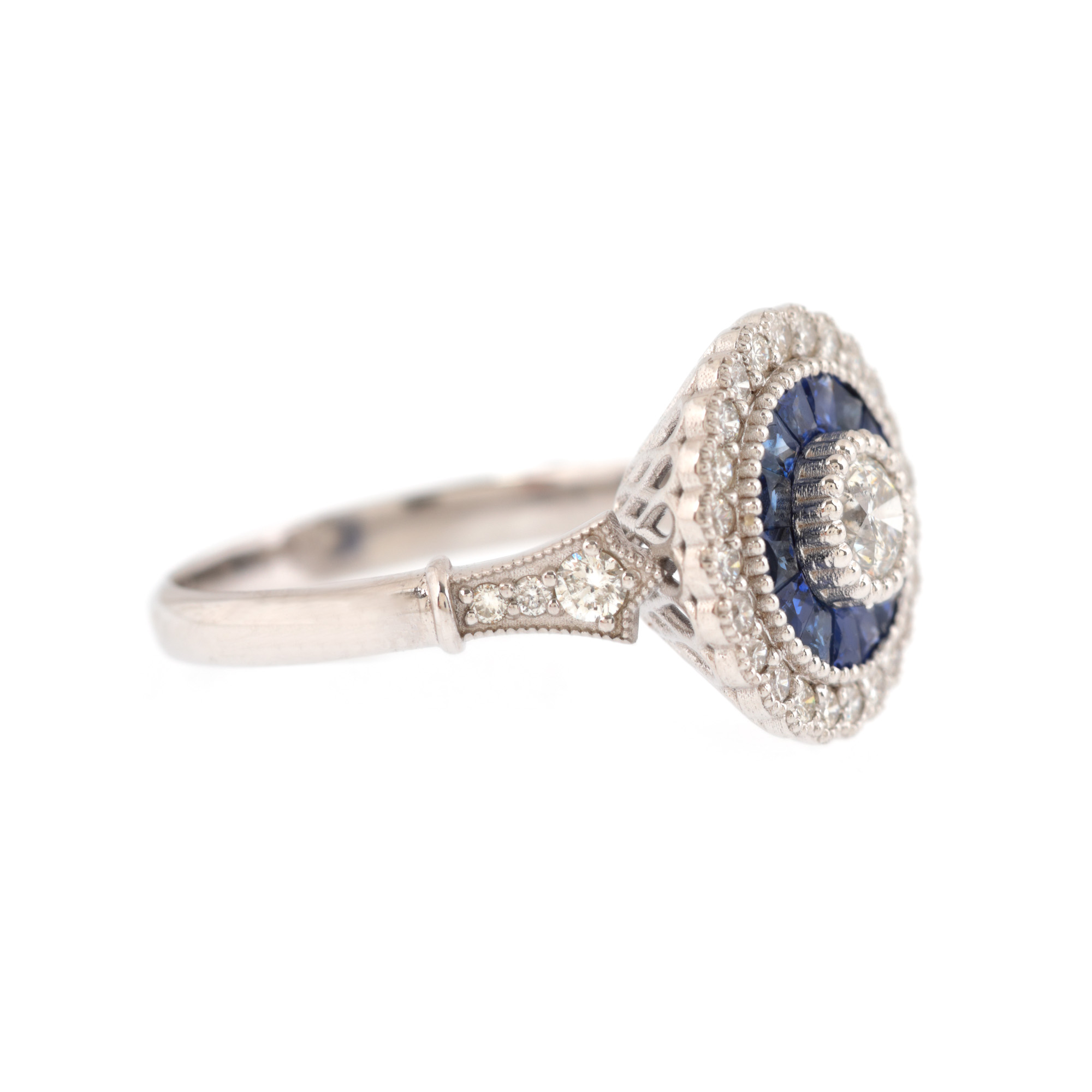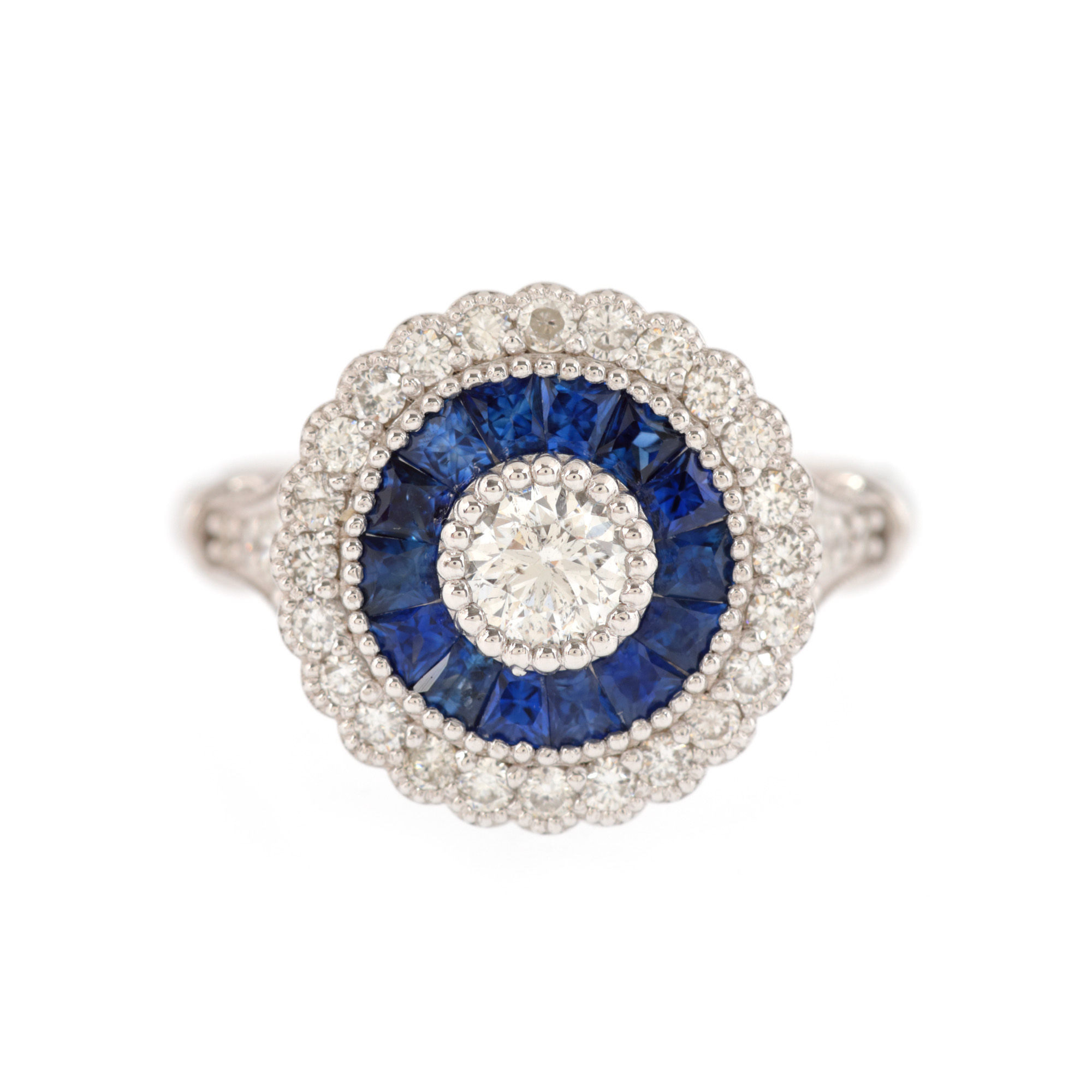 48. Inel în manieră Art Deco, din aur alb, cu o rozetă de diamante și safire
