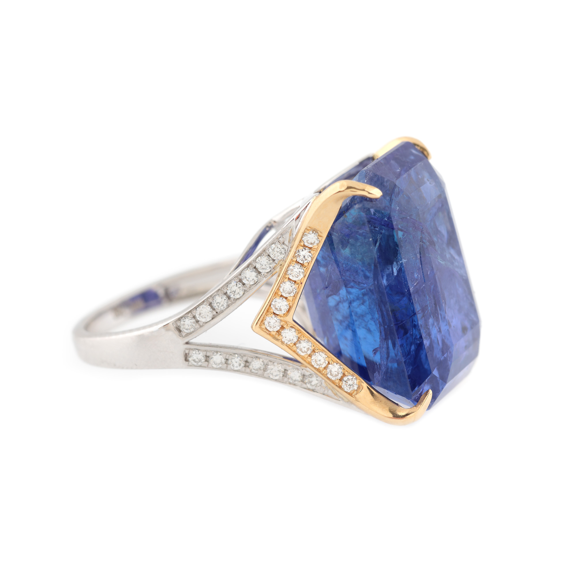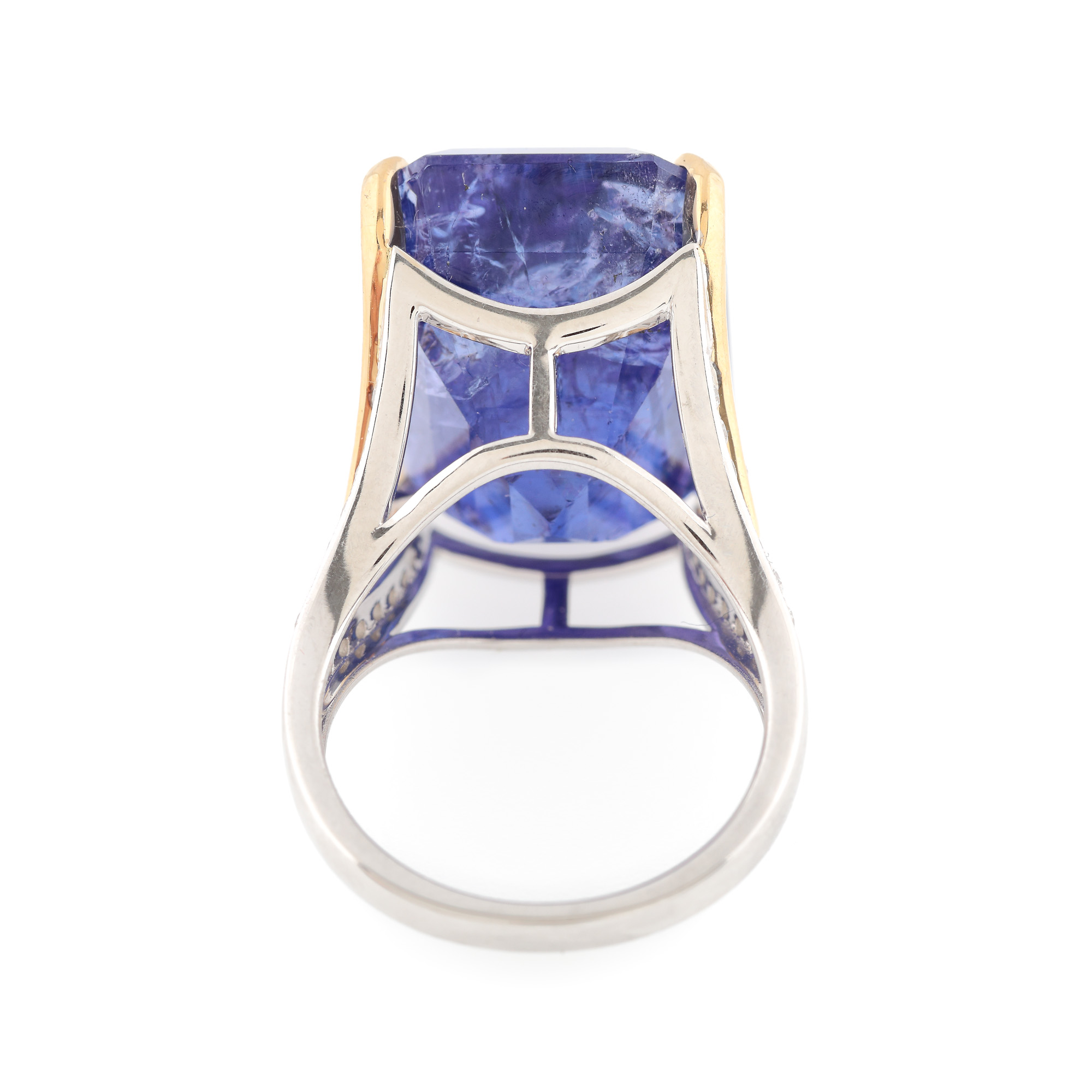 25. ”Natural Blue” - inel din aur în două culori, decorat central cu tanzanit deep bluish-violet și briliante, însoțit de certificat gemologic ALGT, provine din colecția unui arhitect