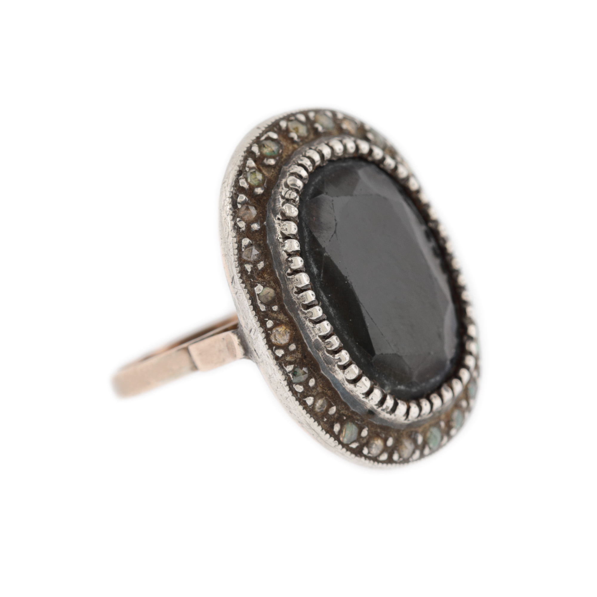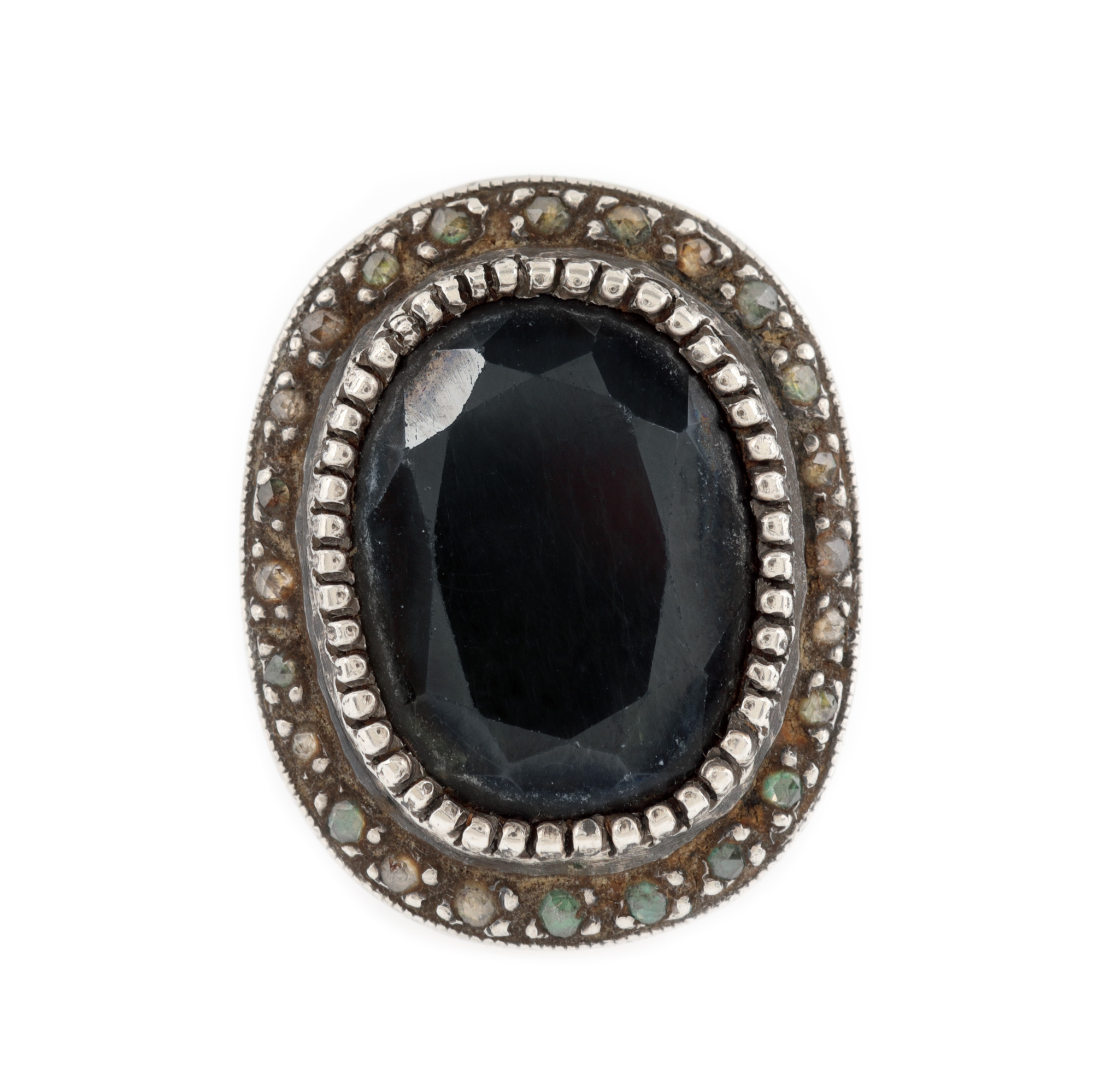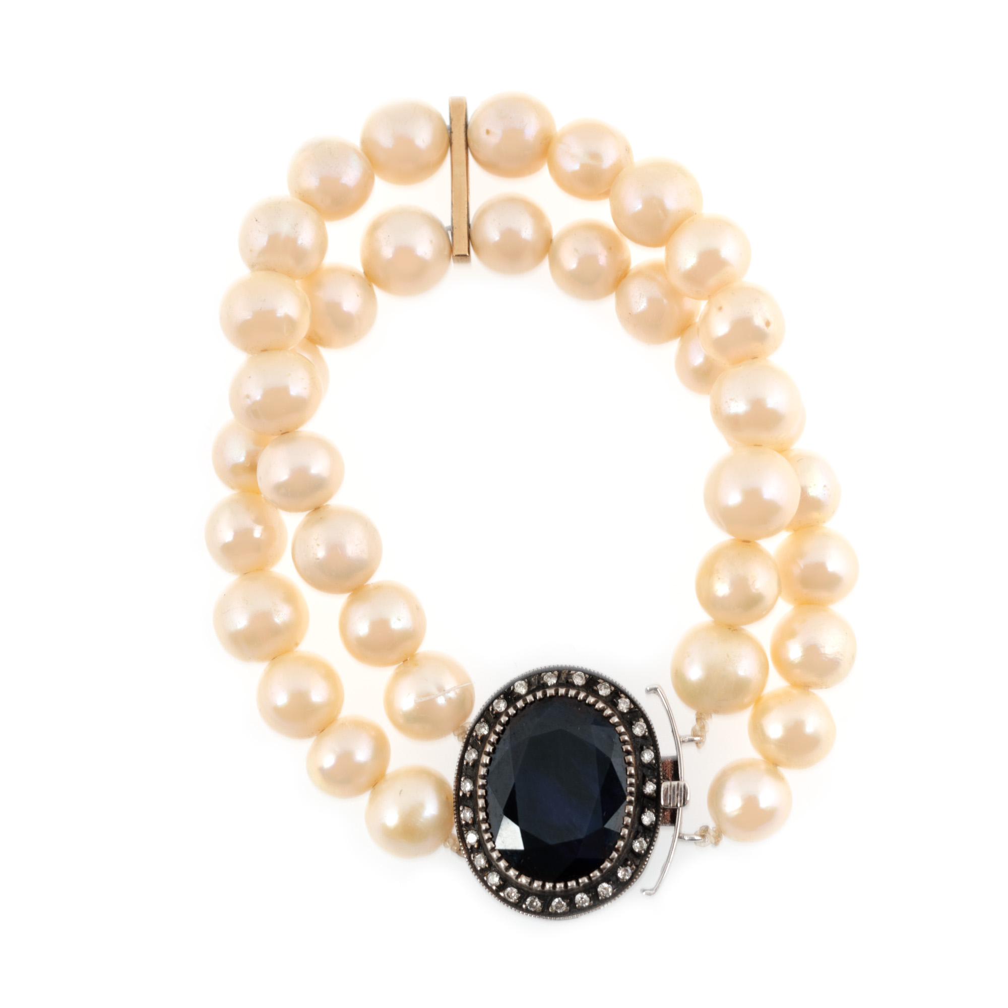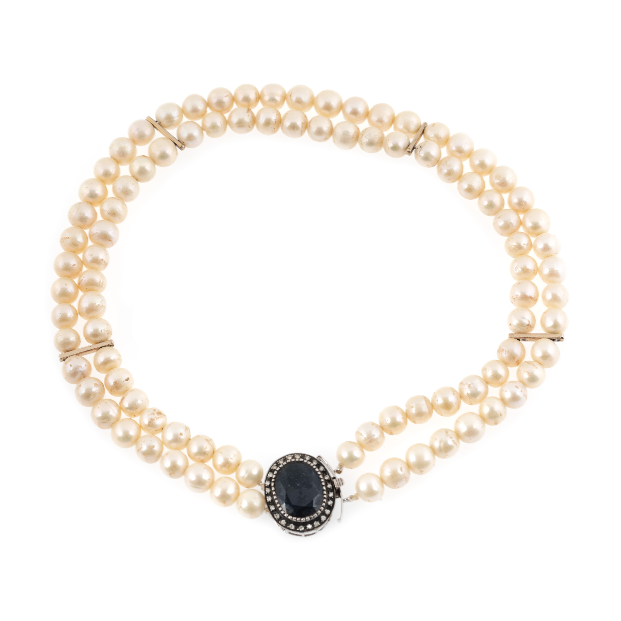 72 diamante (48 rotunde briliant, 24 rose cut), culoare J-O, claritate VS-I2, cca. 0,7 ct.; 3 safire oval fațetate, culoare albastru, claritate heavily included, cca. 35,00 ct. și perle de cultură rotunde, culoare alb, d=8,8-10,49 mm