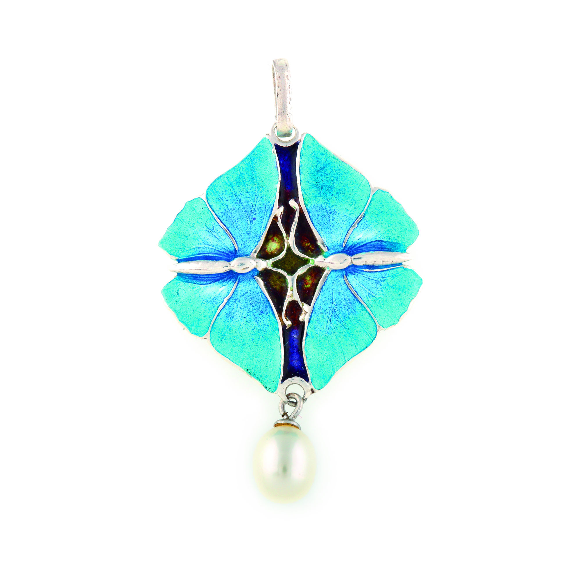 283. 'Fluturi' - pandantiv Art Nouveau din argint, decorat cu email şi perlă, cca. 1900