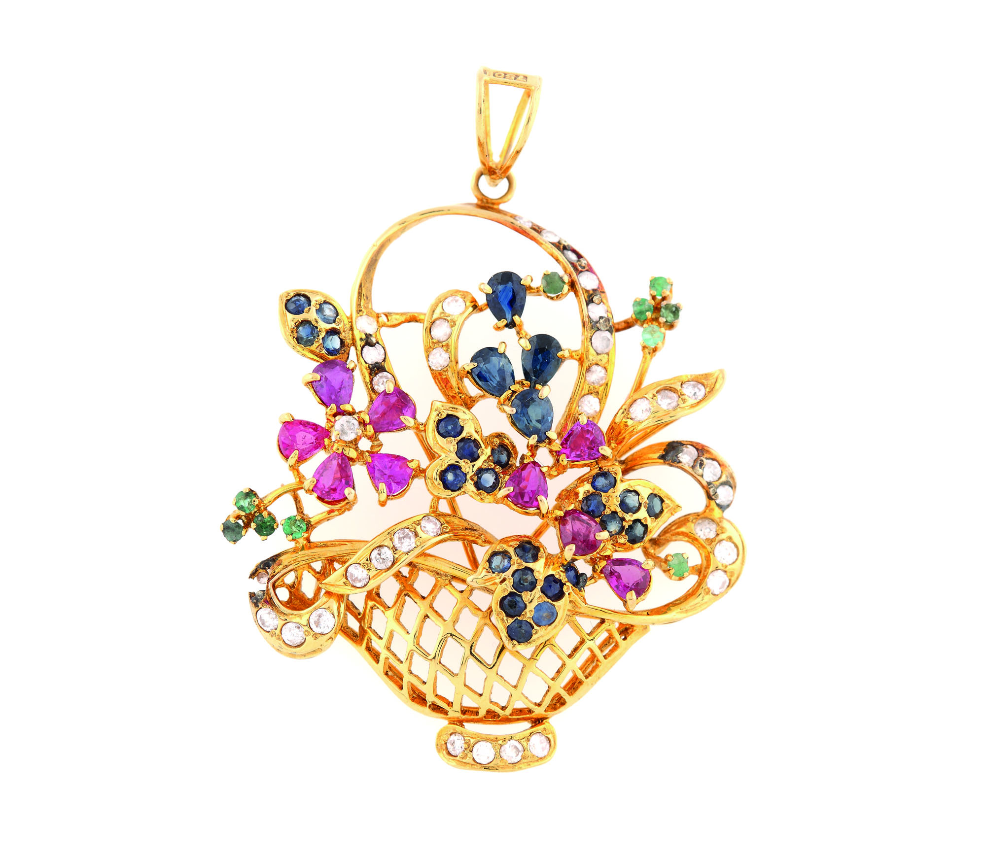 315. Frumoasă broșă din aur, în formă de coșuleț, decorată cu diamante, safire, smaralde și rubine
