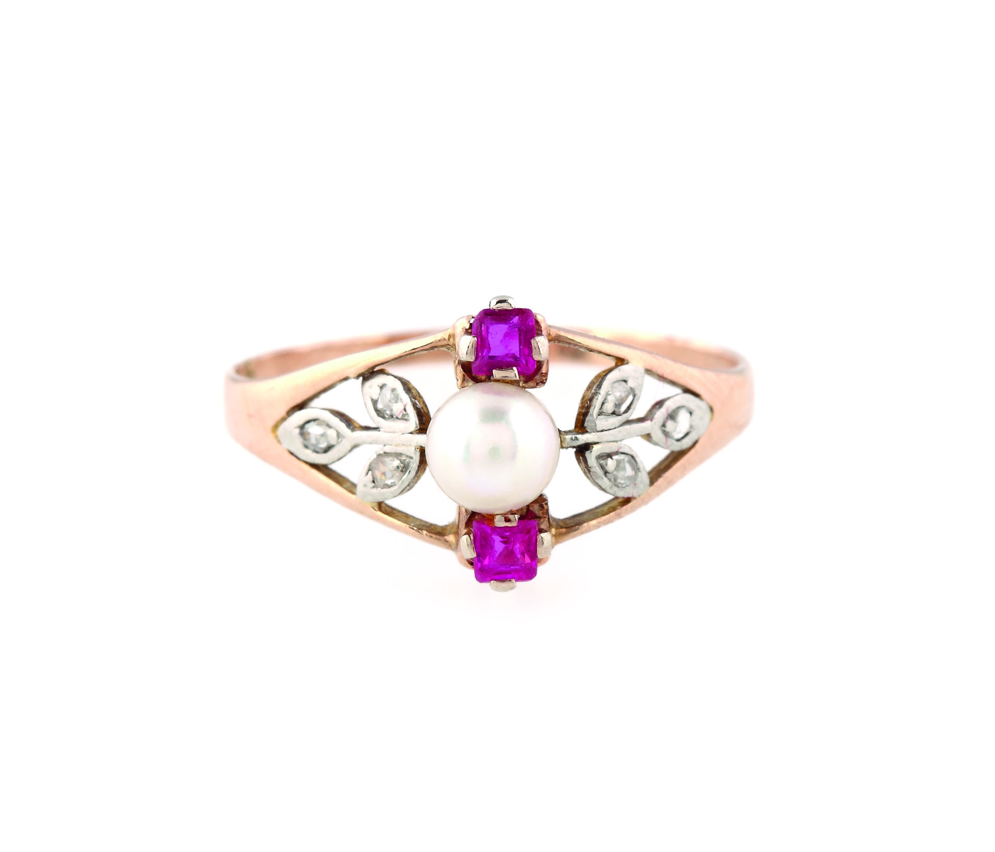 318. Delicat inel din aur, decorat cu perlă, diamante şi rubine, cca. 1920