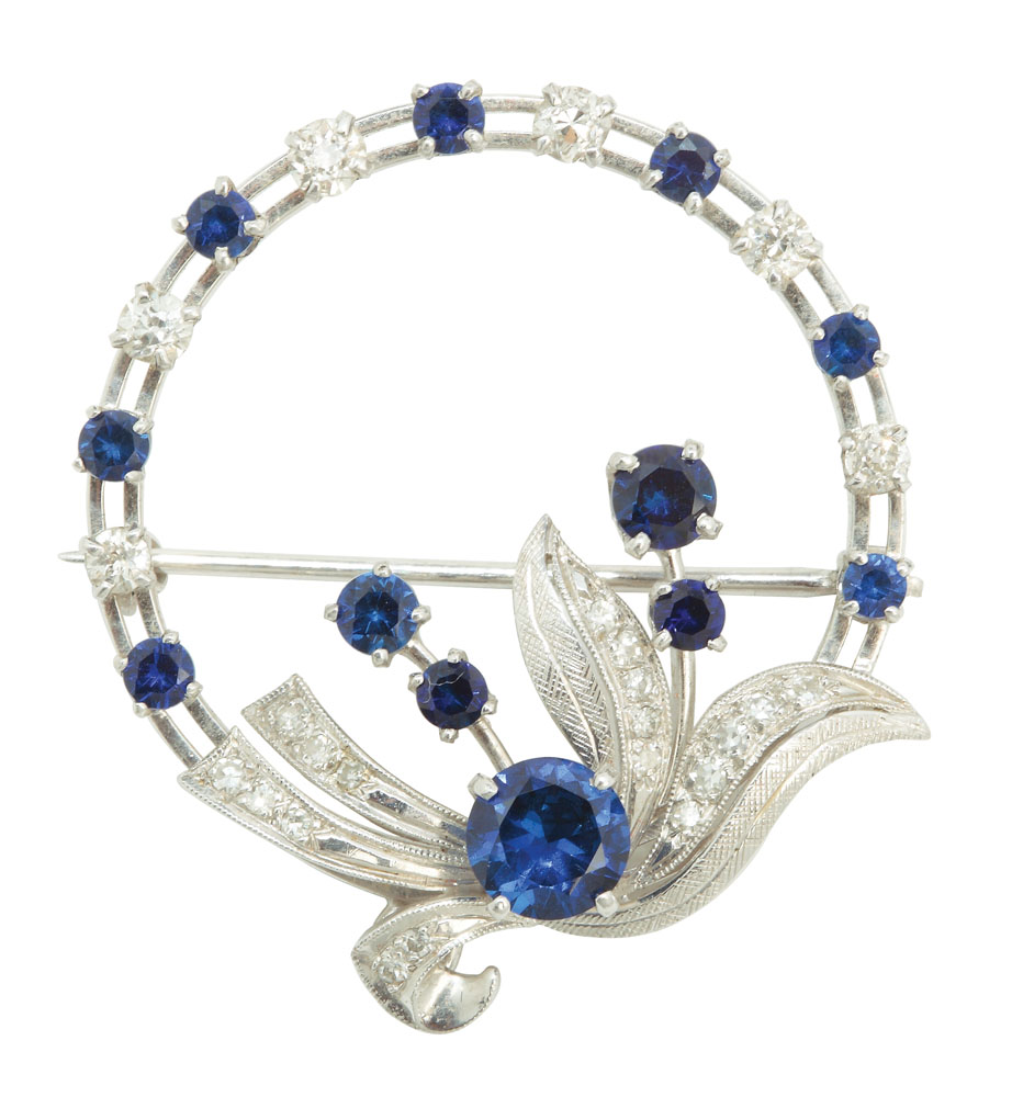 4. Broşă-floare de safir, din aur alb, decorată cu diamante și safire