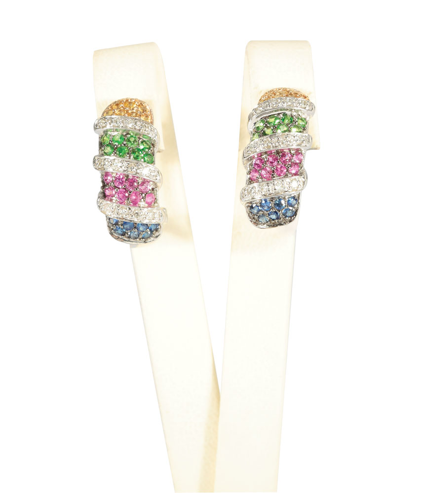 8. Pereche de cercei-curcubeu, din aur alb, decoraţi cu diamante, safire, rubine, granate și topaz