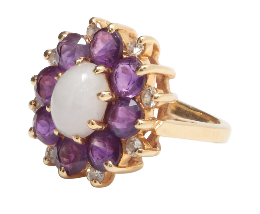 10. Inel entourrage din aur, decorat cu diamante și ametiste