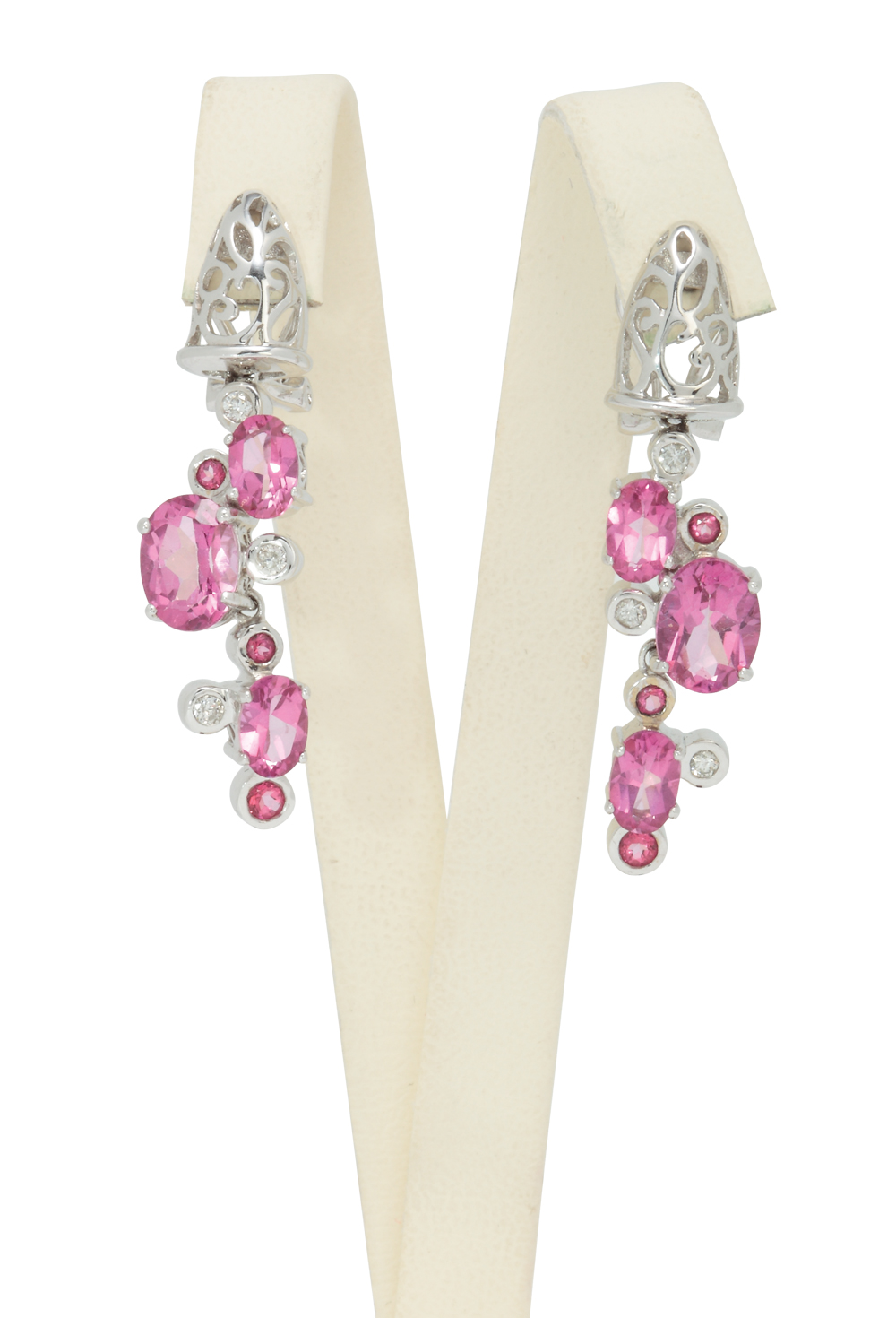 11. Cercei de seară, din aur alb, decoraţi a-jour cu diamante şi turmaline