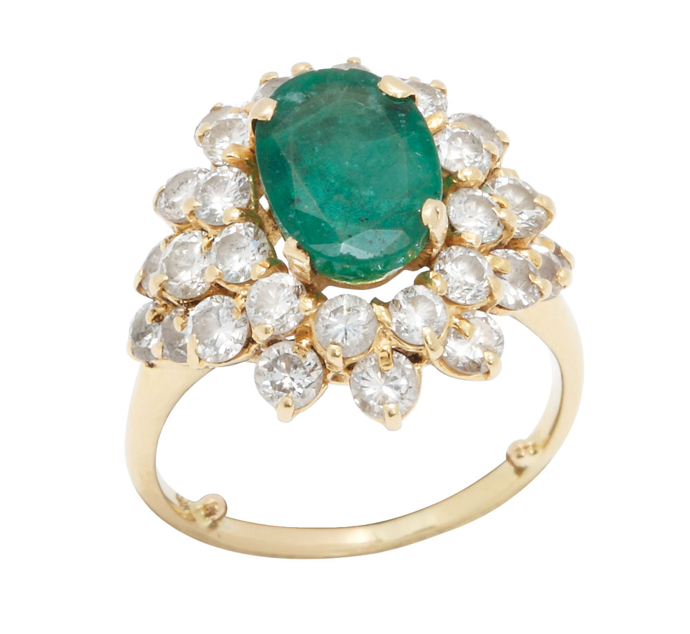 14. Inel din aur, decorat cu smarald central și diamante
