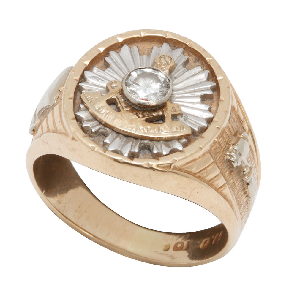 20. Inel masonic din aur, decorat cu diamant şi simbolurile specifice frăţiei: echerul şi compasul