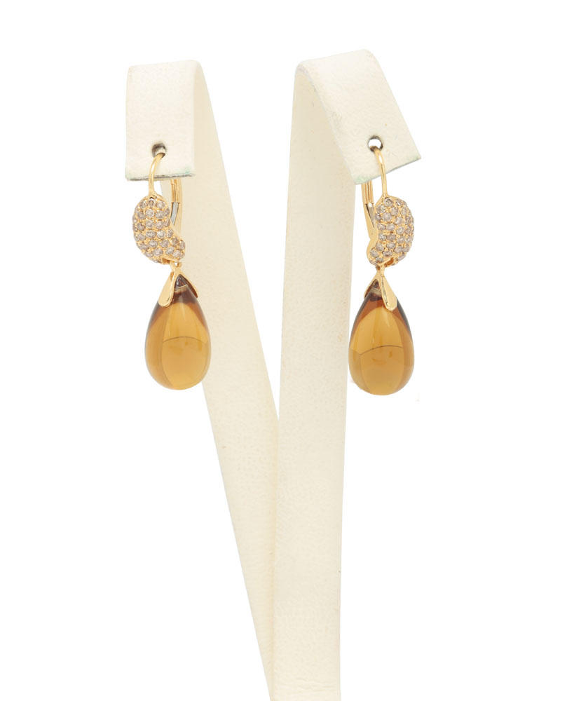 23. Cercei-lacrimă, din aur, decoraţi cu cuarţ fumuriu şi pavaj de diamante