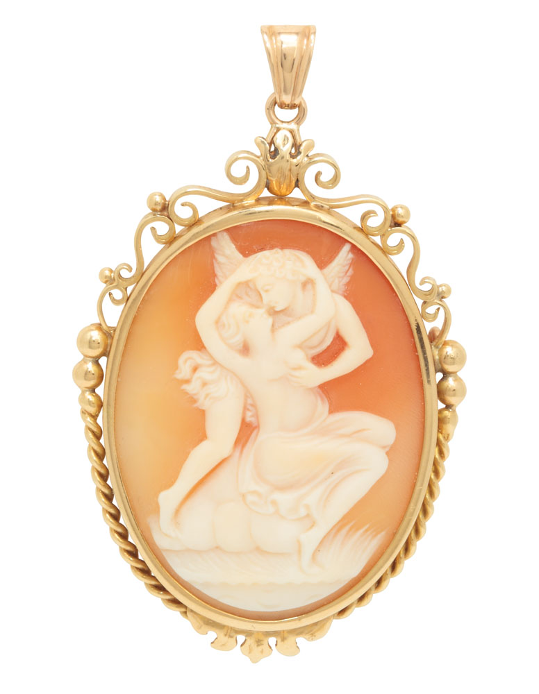 24. Pandantiv-broşă din aur şi camee, decorată cu scenă de amor