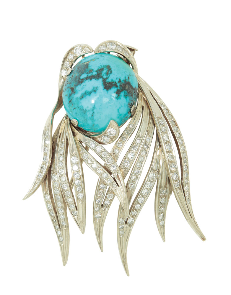 34. Broşă din aur alb, decorată cu diamante şi turcoaz de Arizona