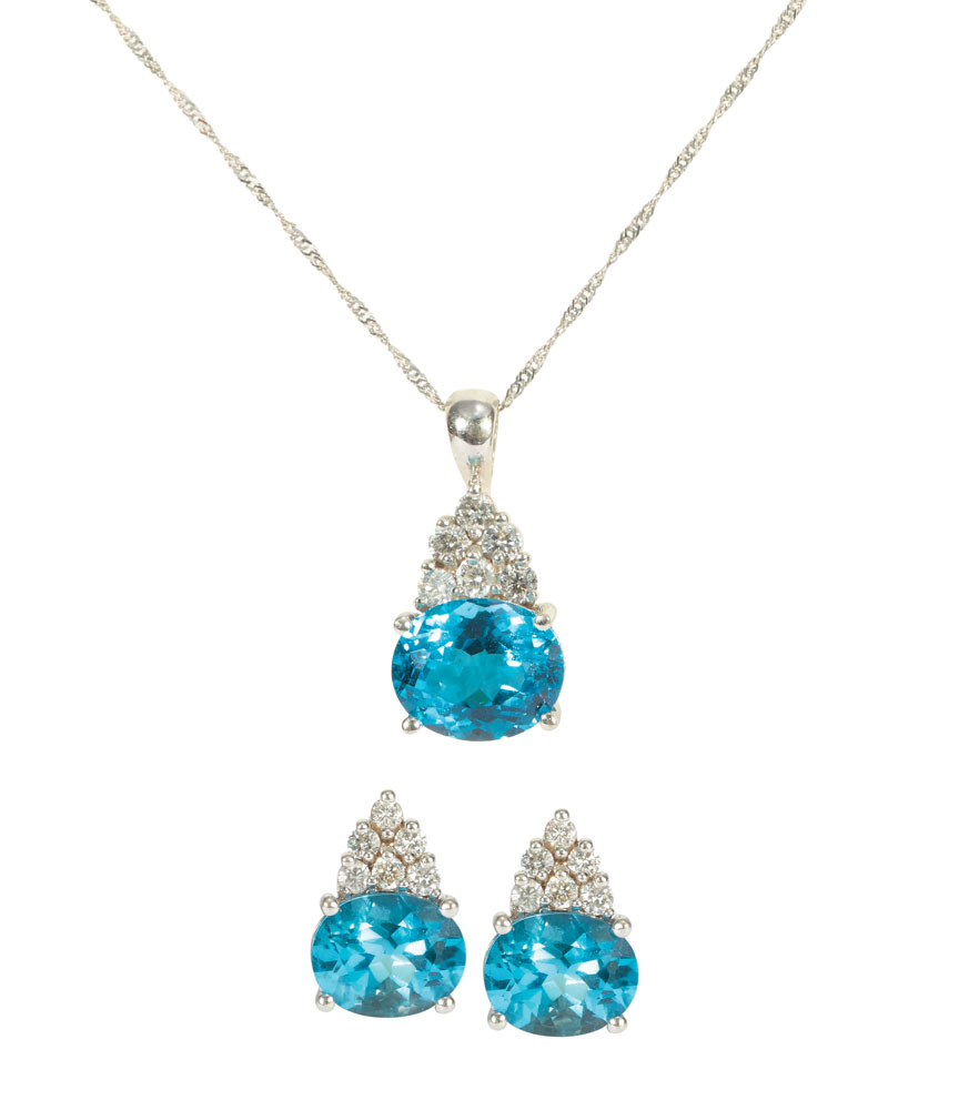 35. Set de cercei şi pandantiv din aur alb, decorat cu topaze şi diamante