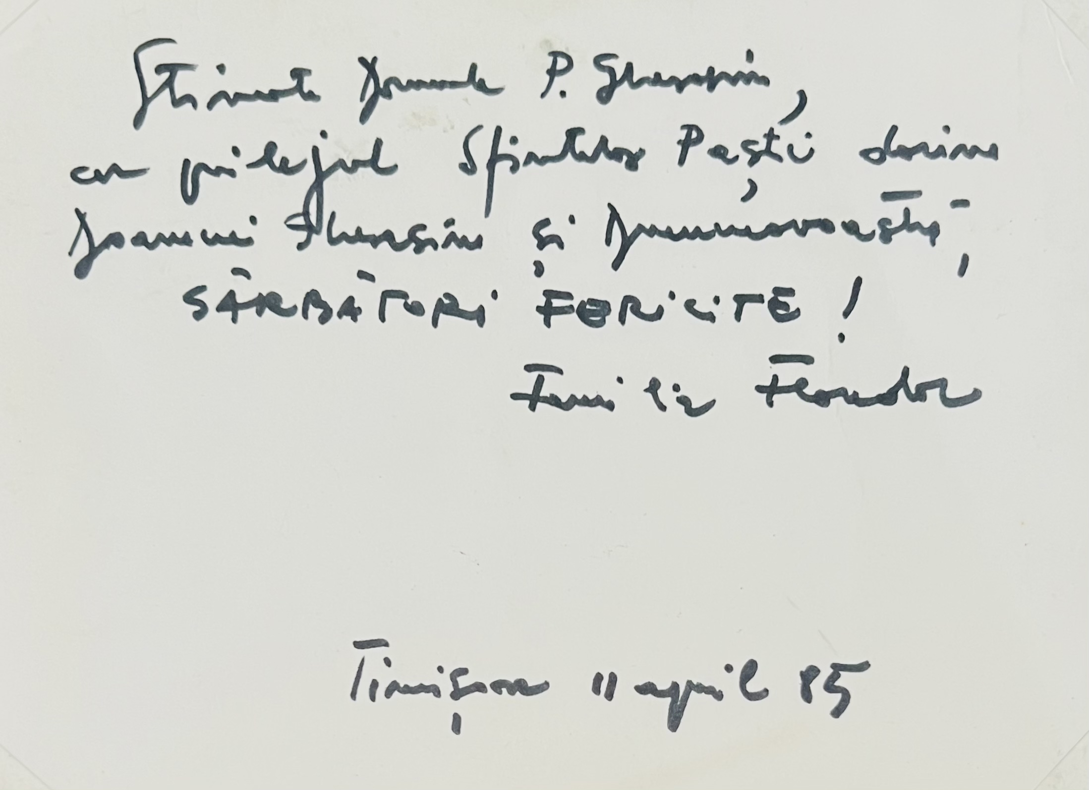 semnat, datat, localizat și dedicat pe verso, cu negru, "Stimate domnule P. Gherasim, Cu prilejul Sfintelor Paști, dorim doamnei Gherasim și dumneavoastră, Sărbători Fericite! Familia Flondor, Timișoara, 11 aprilie (19)85"