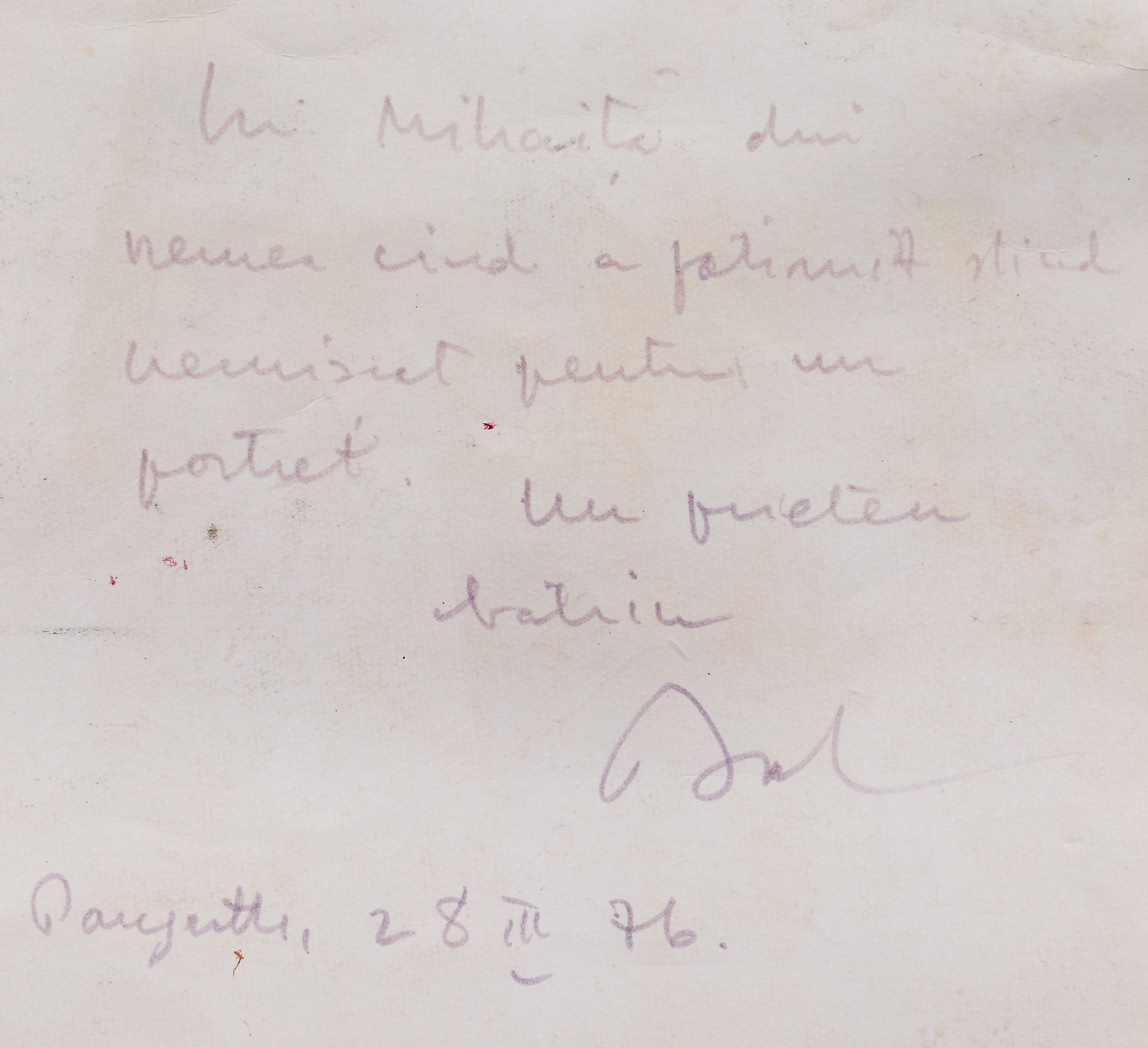 ”Lui Mihăiță, din vremea când a pătimit stând nemișcat pentru portret. Un prieten, Corneliu Baba. Pangratti, 28 III 76.”