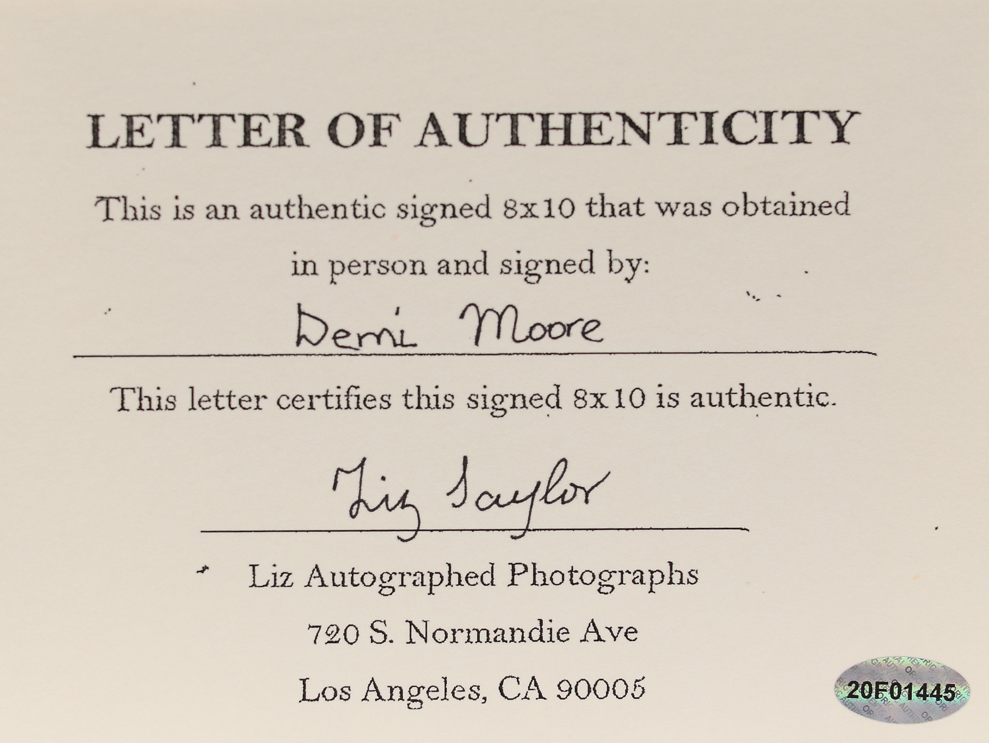 51. Fotografie ilustrând-o pe Demi Moore, cu semnătura olografă a actriței, însoțită de certificatul de autenticitate