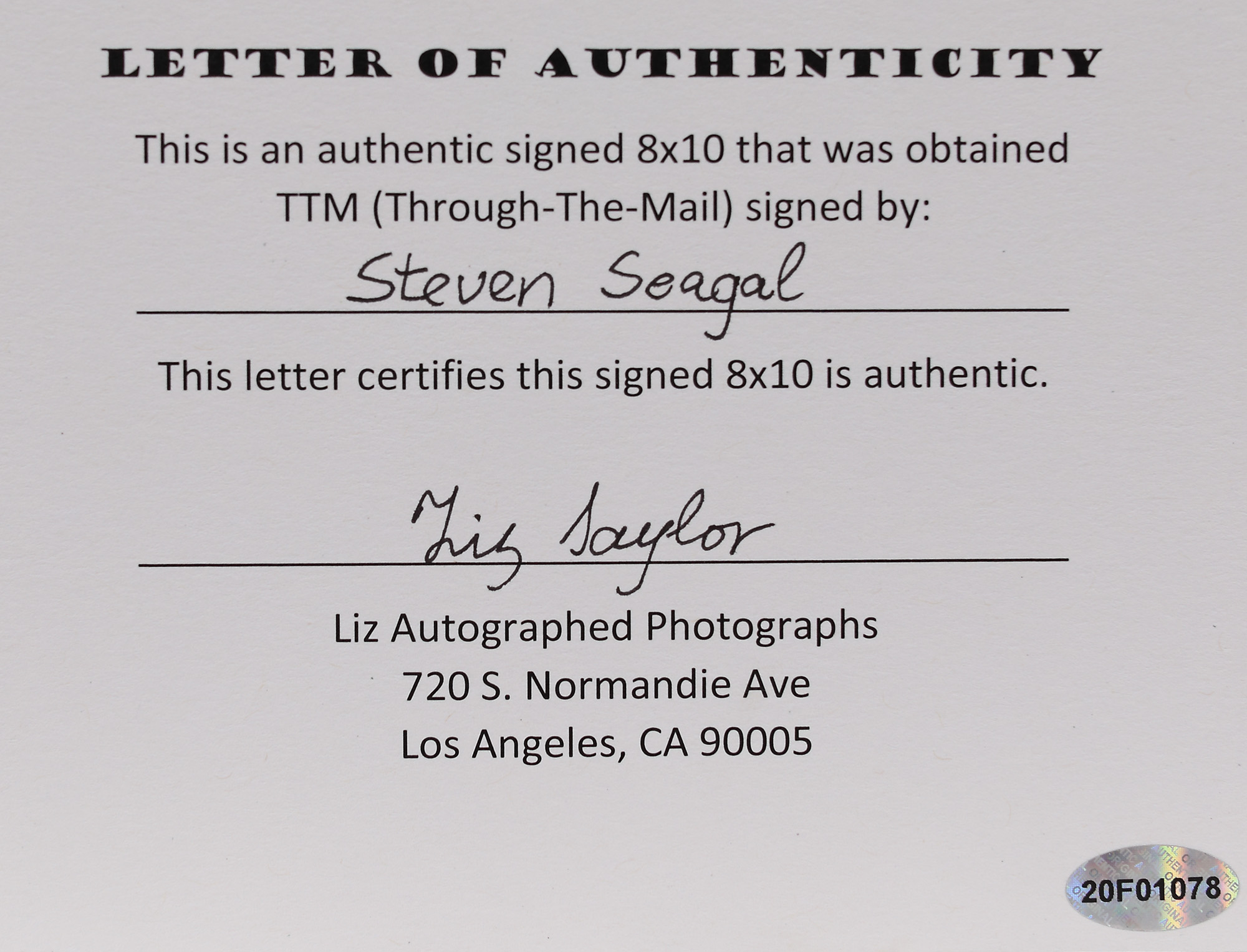 49. Fotografie ilustrându-l pe Steven Seagal, cu semnătura olografă a actorului, însoțită de certificatul de autenticitate