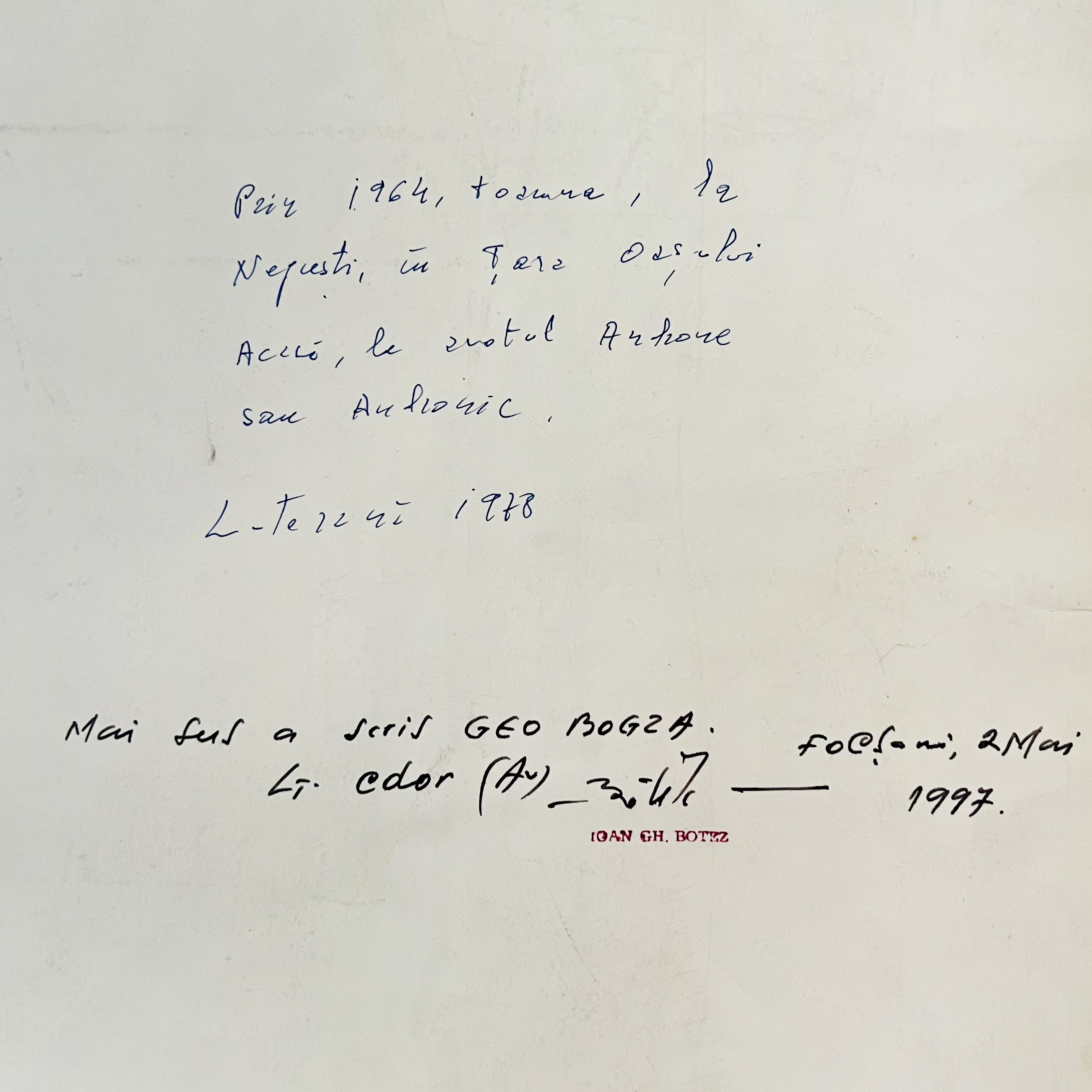 Fotografie Geo Bogza (1908-1993), cu o însemnare olografă a poetului potrivit căreia fotografia a fost realizată în 1964 la Negreşti, Ţara Oaşului. Poetul pozează într-o ipostază căutată şi jucăuşă alături de două trofee de vânătoare.