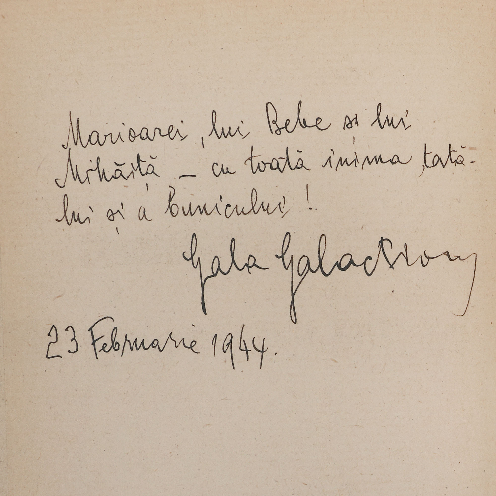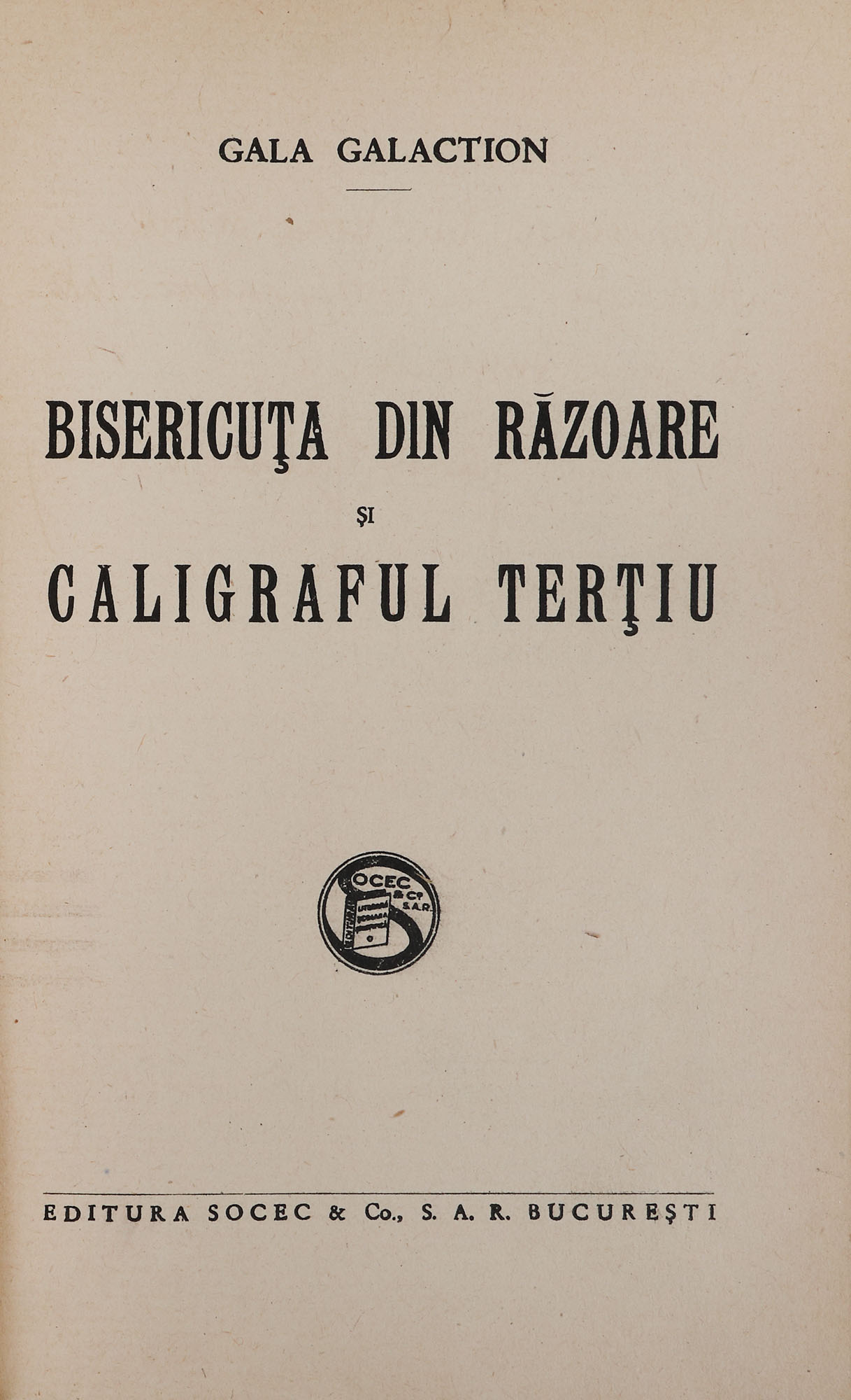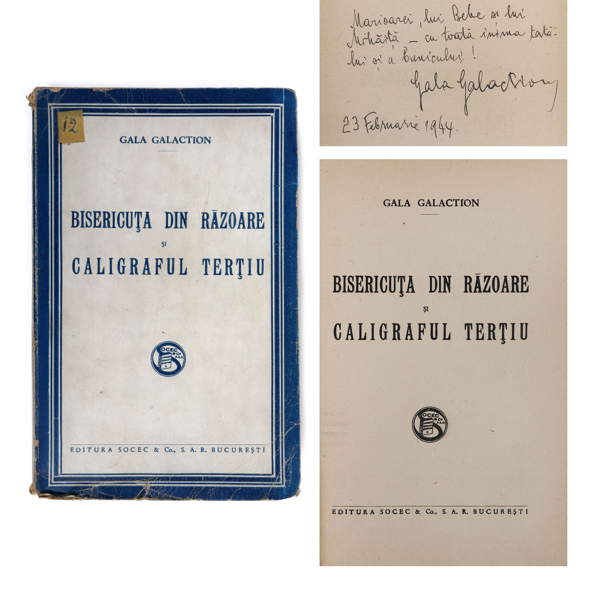 49. ”Bisericuța din Răzoare și Caligraful Terțiu”, de Gala Galaction, București, 1931, cu dedicația ”...cu toată inima tatălui și a Bunicului!” și semnătura olografă a autorului, provine din colecția istorică Șerban Țuculescu-Maria Galaction