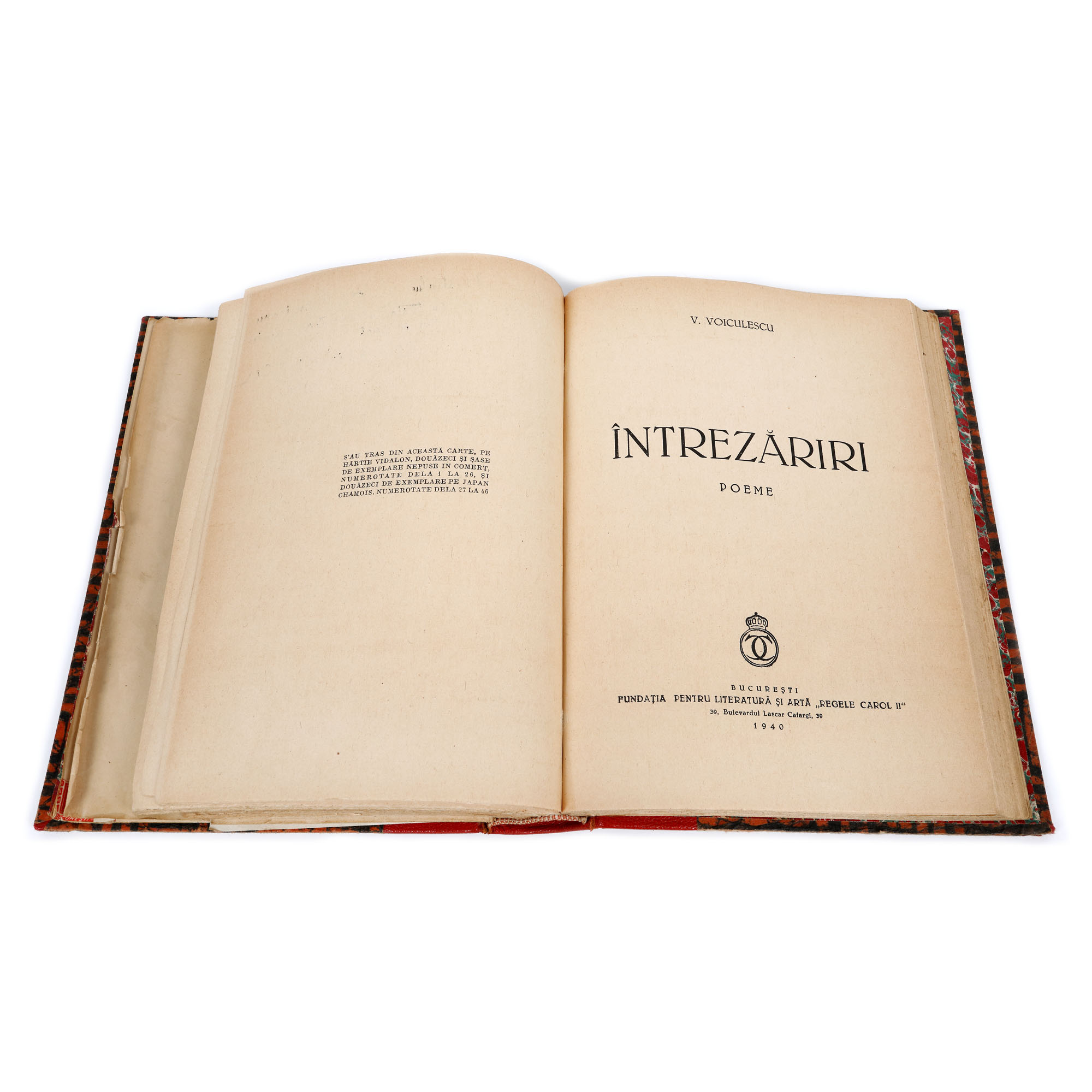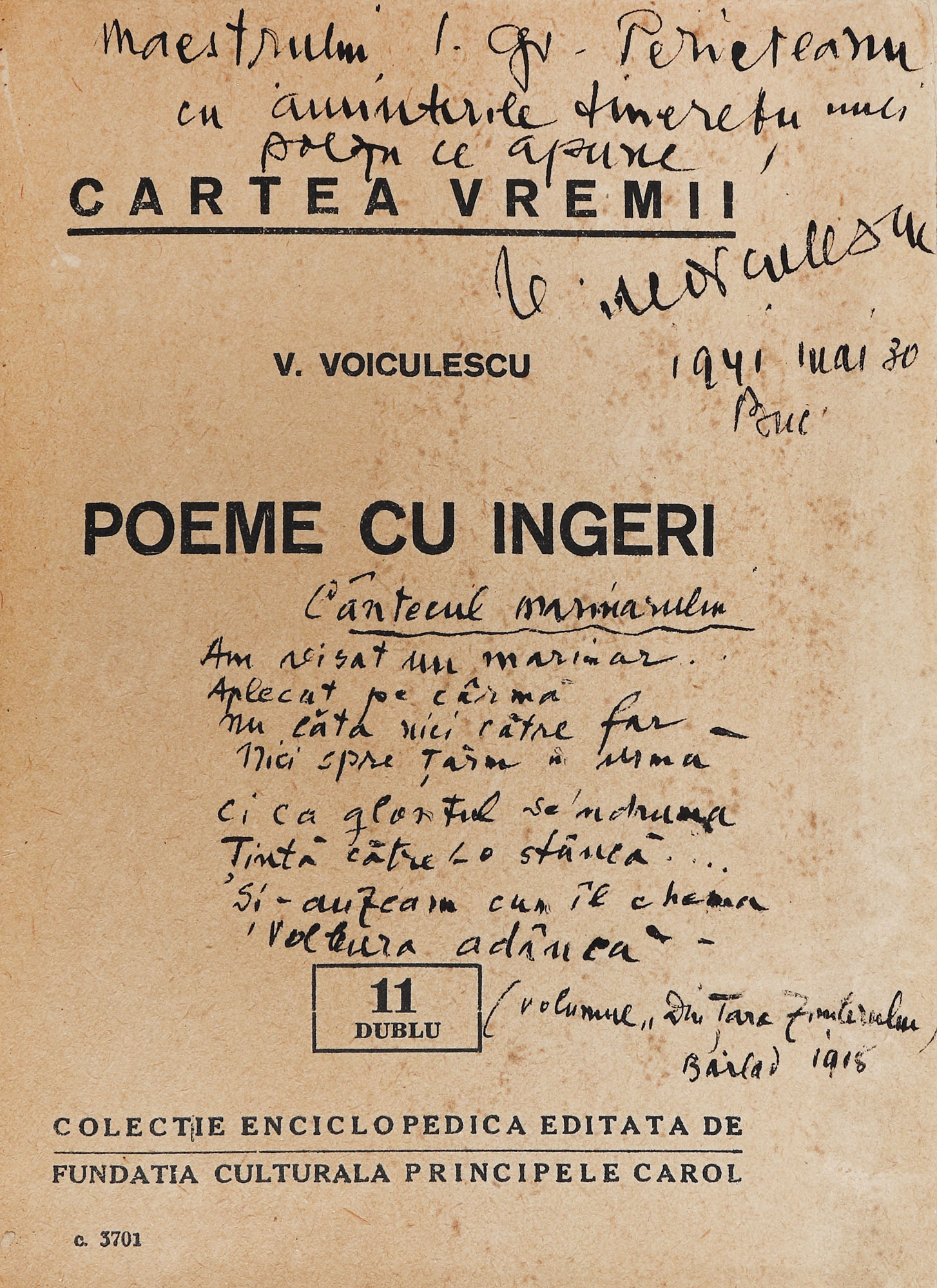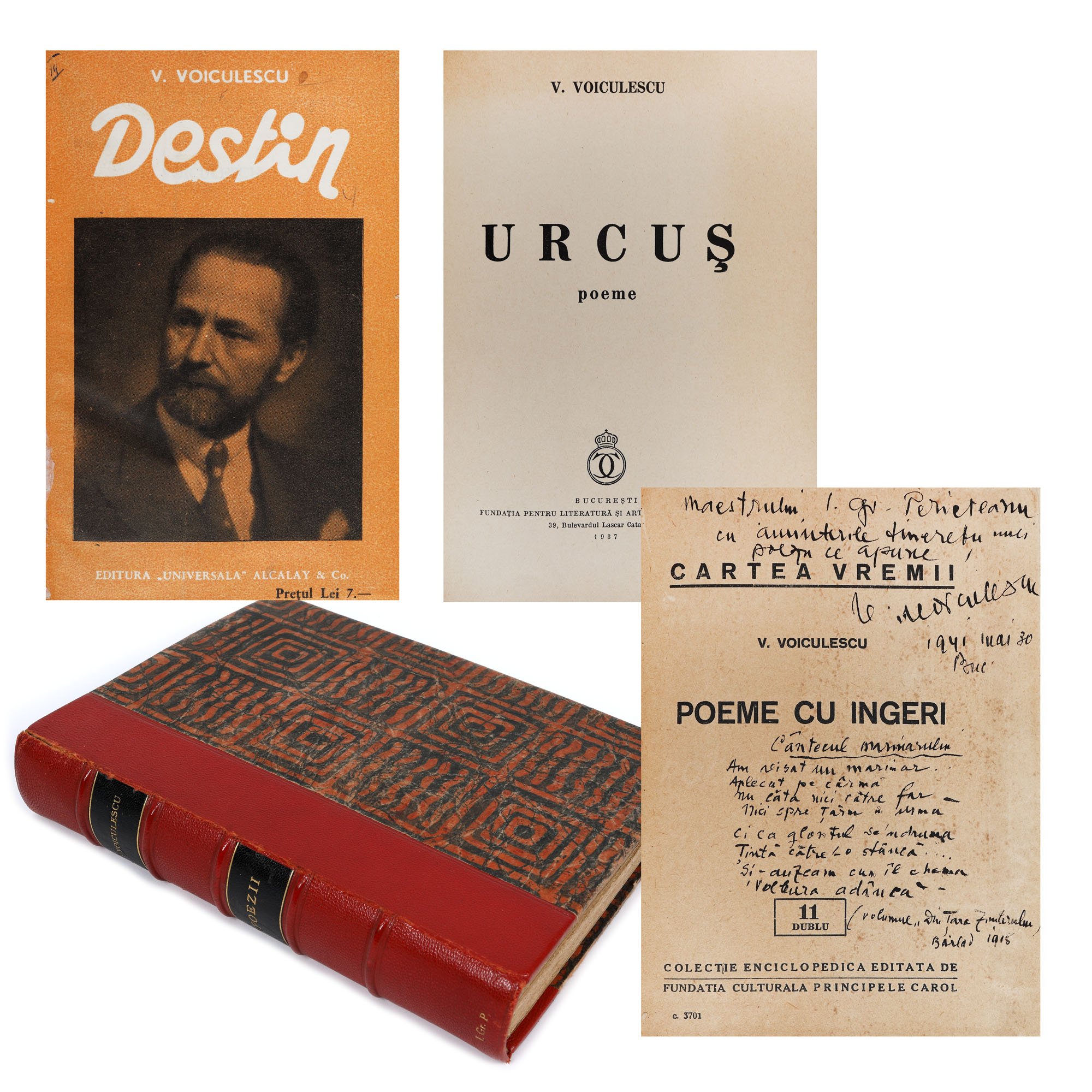 44. Colegat ”Destin”, ”Poeme cu îngeri”, ”Pârgă” și ”Urcuș”, de Vasile Voiculescu, București, cu dedicația și semnătura olografă a autorului către avocatul Ioan Gr. Periețeanu și un fragment din poemul ”Cântecul marinarului”, provine din colecția avocatului Ioan Gr. Periețeanu