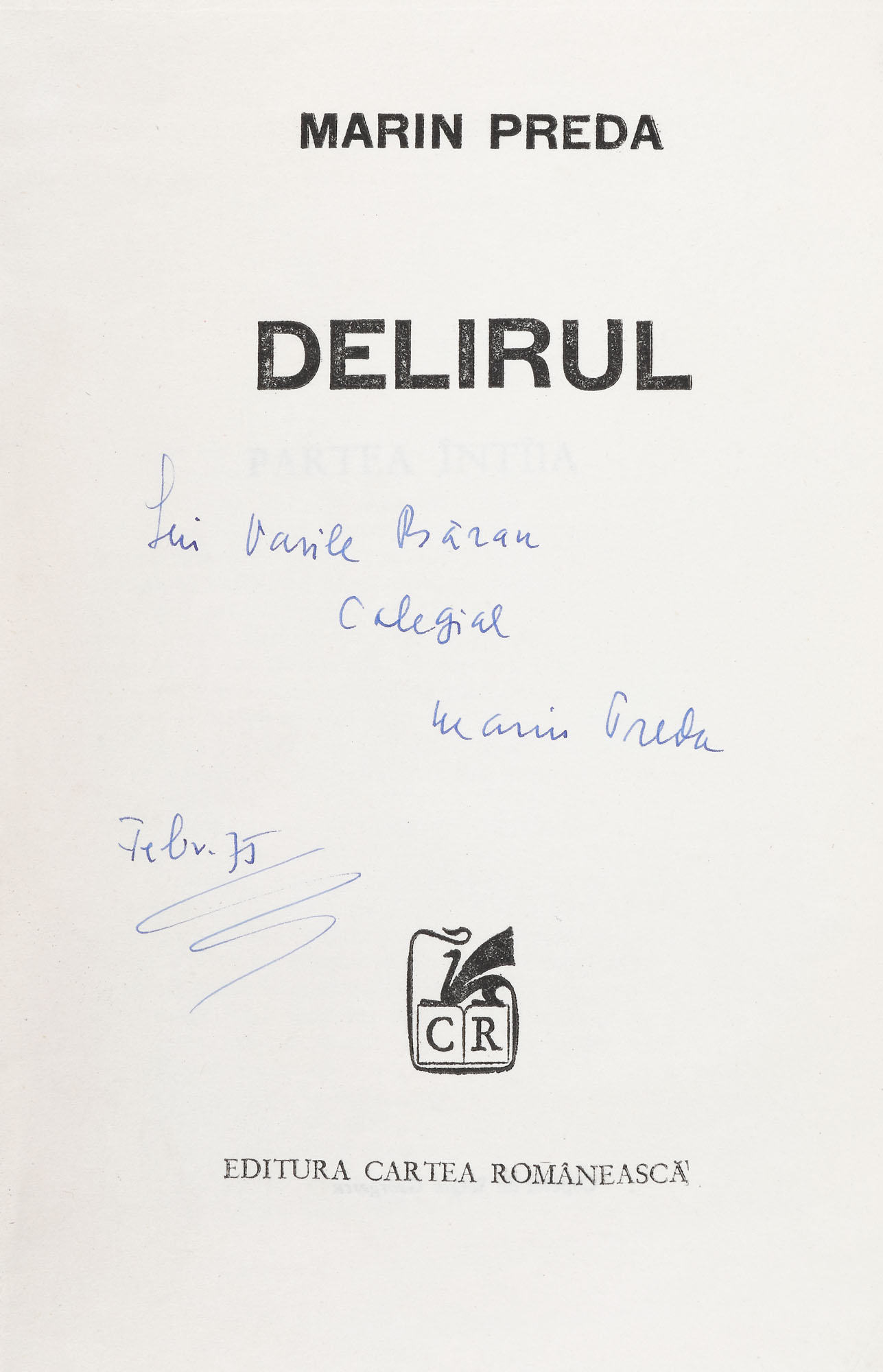 2. Lot format din fotografie ilustrându-l pe Marin Preda și cartea ”Delirul”, de Marin Preda, București, 1975, purtând dedicația și semnătura olografă a autorului către romancierul Vasile Băran