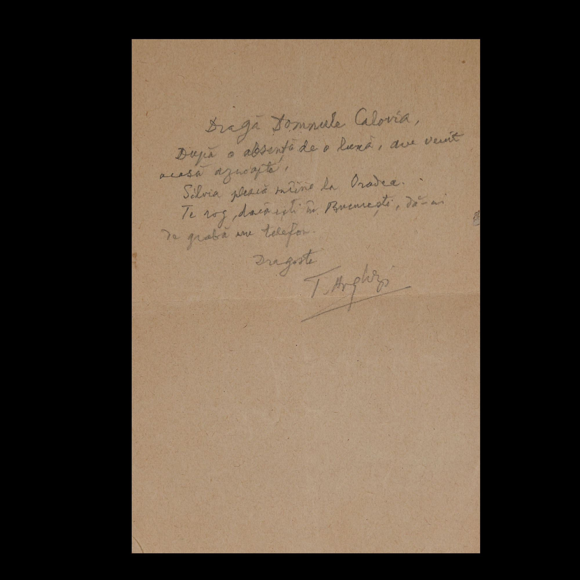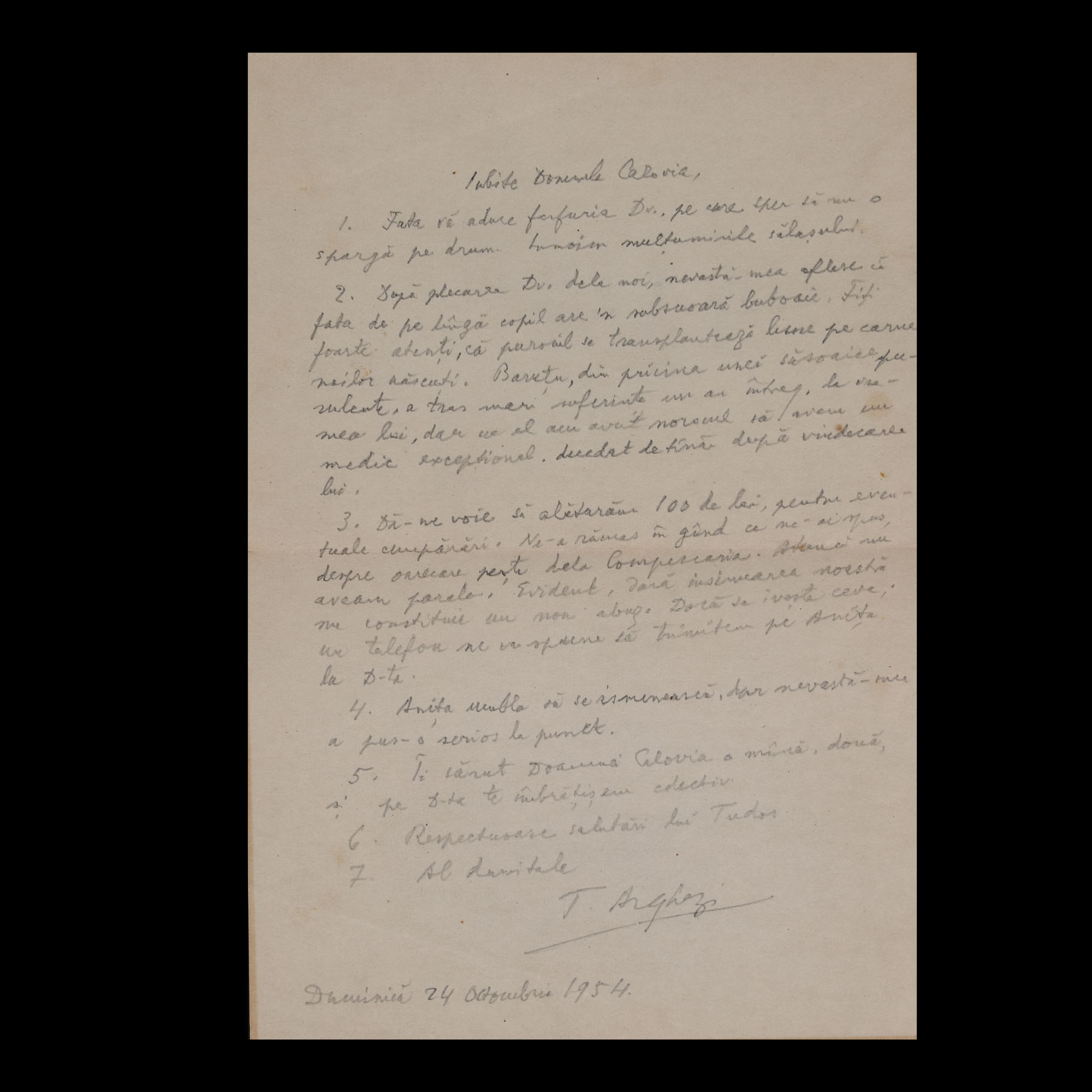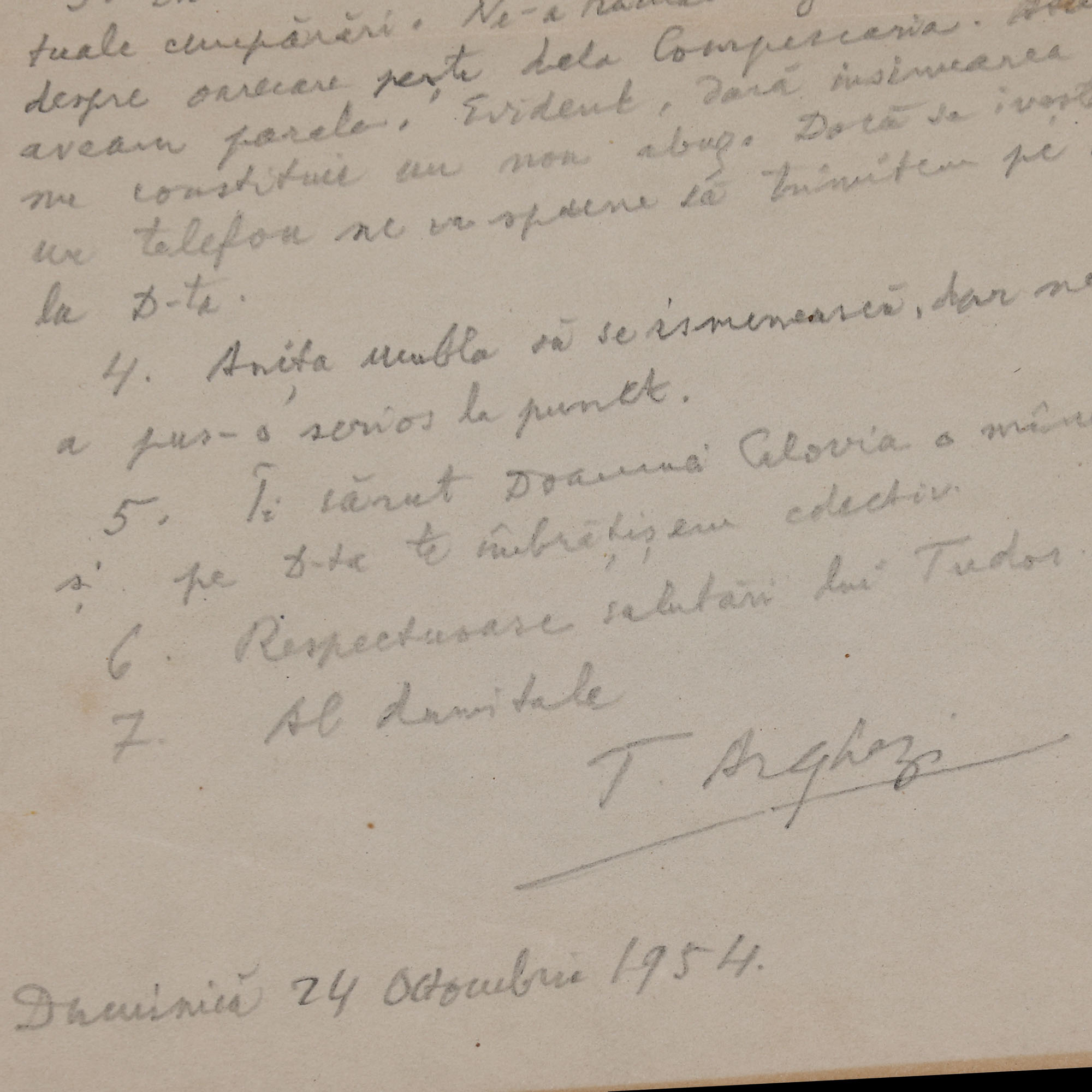 31. Lot format din patru scrisori și un bilet trimise de Tudor Arghezi către scriitorul Ion (Marinescu) Calovia, 1954, cu plic și semnătura olografă a lui Tudor Arghezi (8 file)