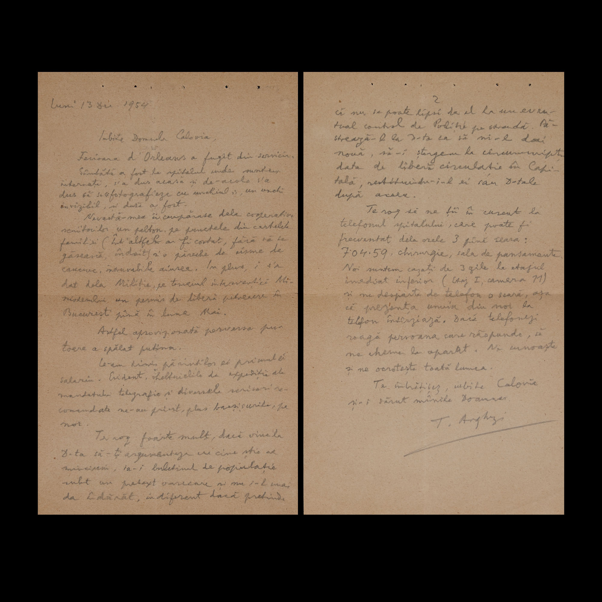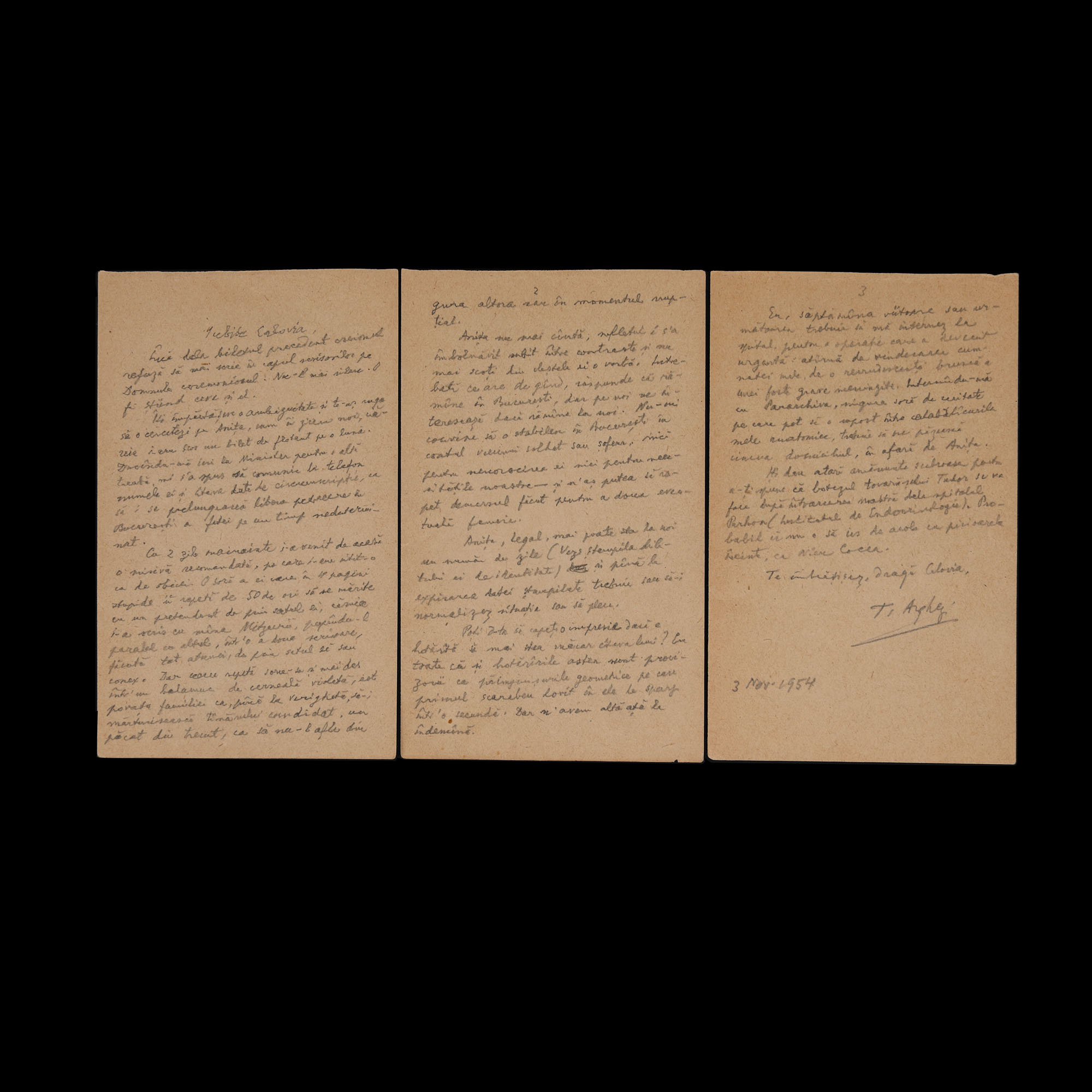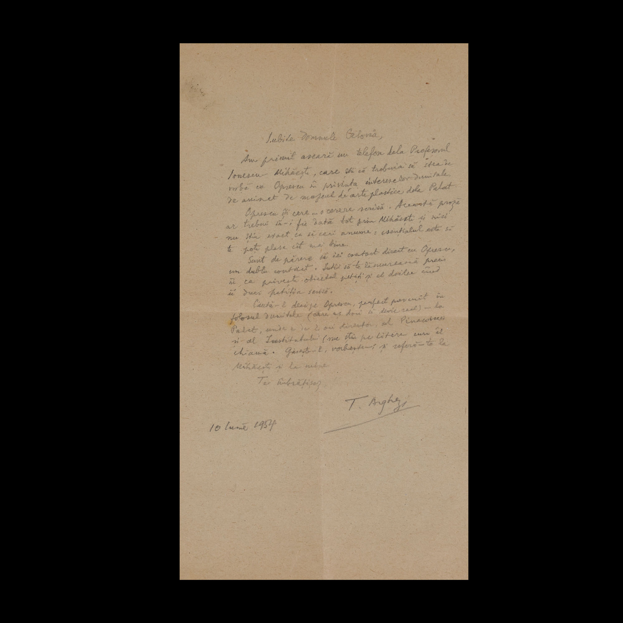 31. Lot format din patru scrisori și un bilet trimise de Tudor Arghezi către scriitorul Ion (Marinescu) Calovia, 1954, cu plic și semnătura olografă a lui Tudor Arghezi (8 file)