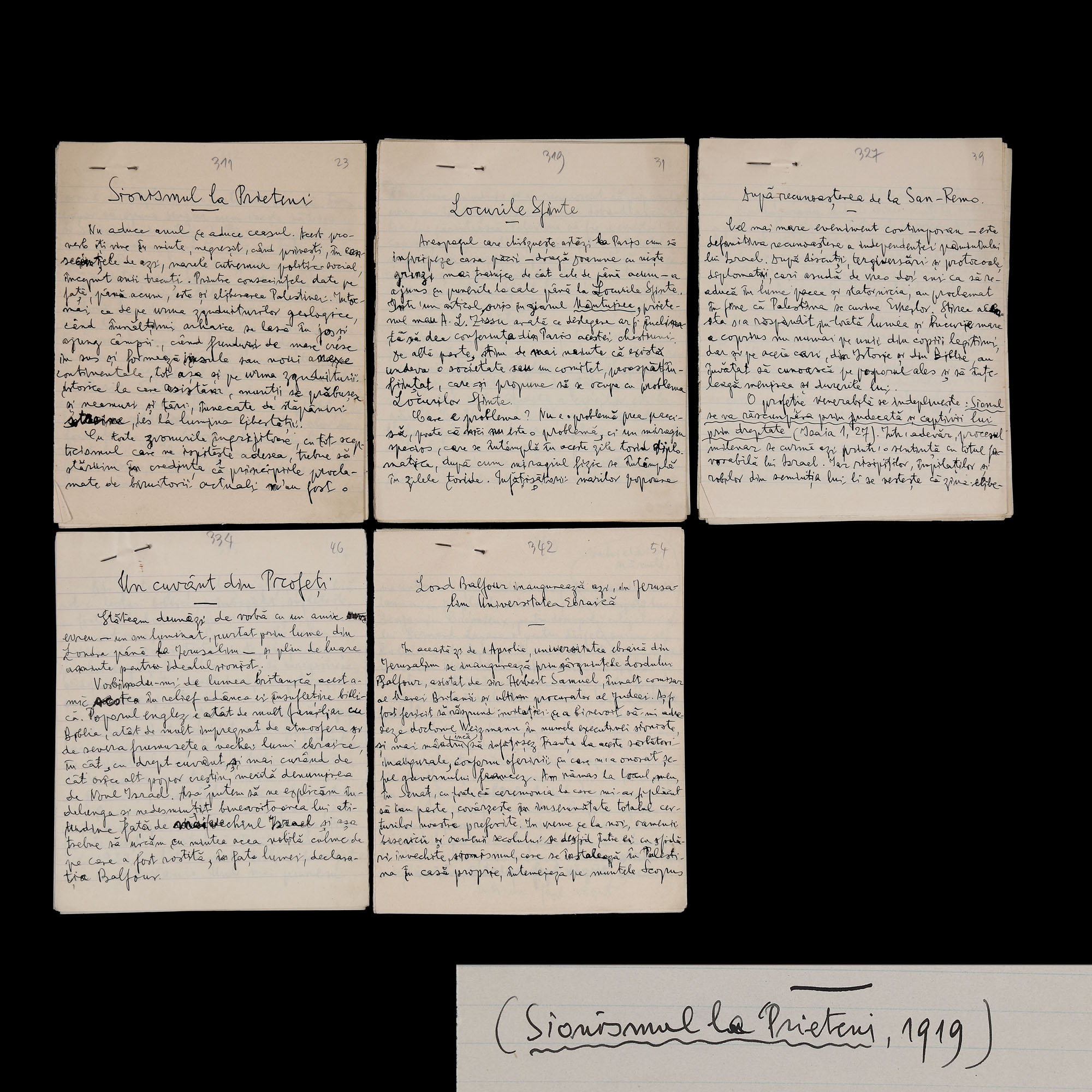 Lotul conține următoarele titluri: ”Sionismul la Prieteni” (1919), ”Locurile Sfinte” (1919), ”După recunoașterea de la San-Remo” (1920), ”Un cuvânt din Profeți” (1922) și ”Lord Balfour inaugurează azi în Ierusalim Universitatea Ebraică” (1925).