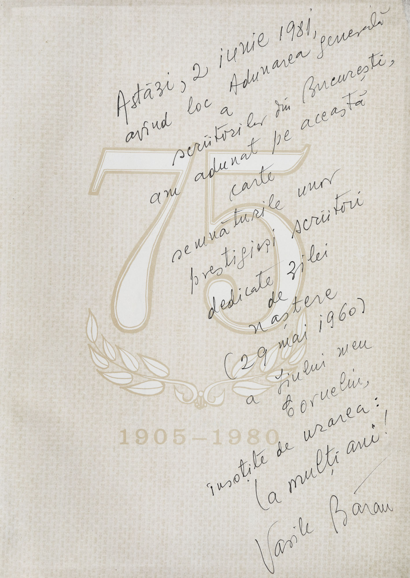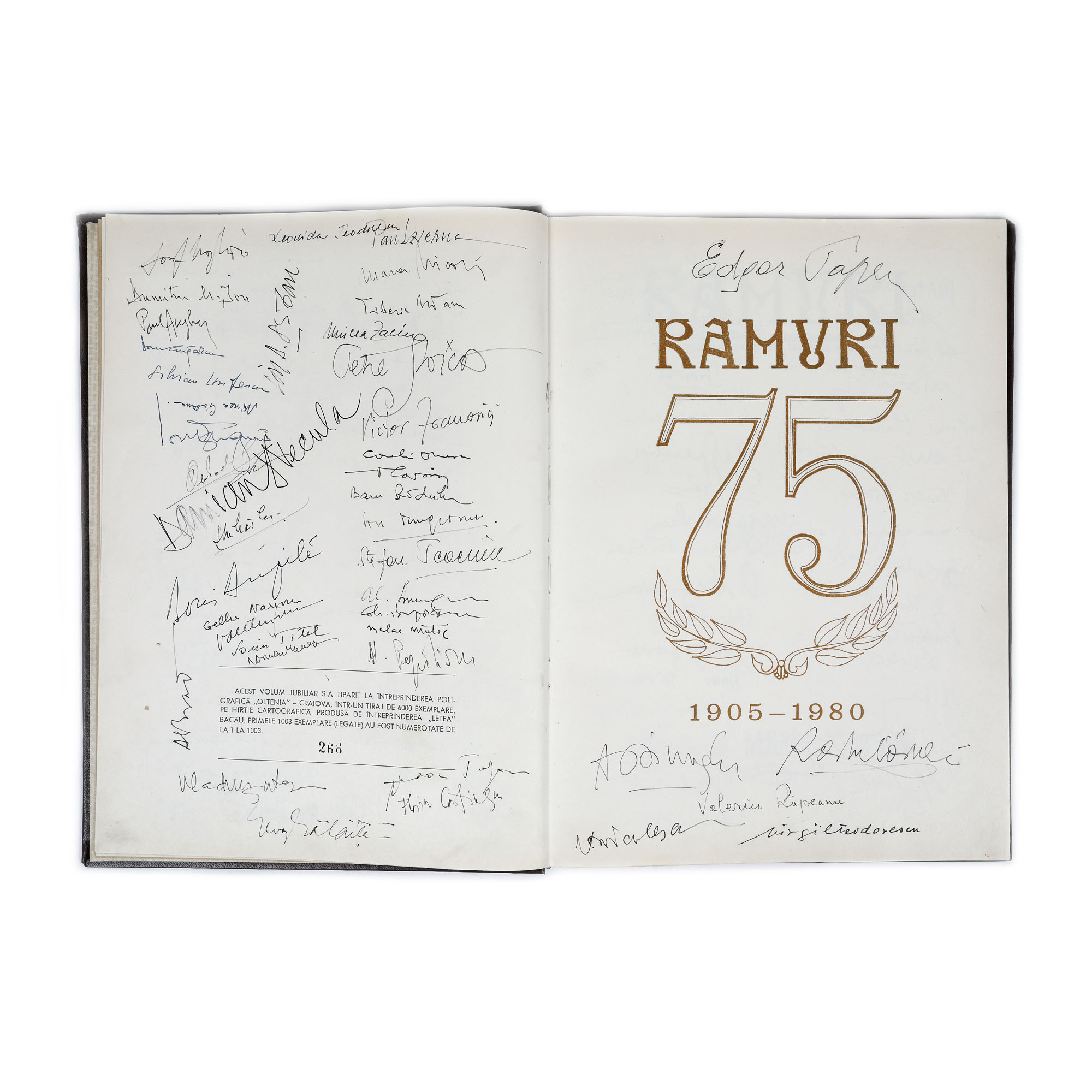 Cu ocazia Adunării Generale a Scriitorilor din București din data 2 iunie 1981 acest volum a fost semnat de: Vasile Băran, George Macovescu, Laurențiu Fulga, Nichita Stănescu, Paul Everac, Ion Nicolescu, Eugen Simion, Romulus și Ileana Vulpescu, Doina Sălăjan, Petre Anghel, Alexandru I. Stefânescu, Lucian Raicu, Ioan Alexandru, Ioana Diaconescu, Cornel Popescu, Traian Iancu, Nina Cassian, Vasile Zamfir, Tudor George, Dumitru M. Ion, Paul Anglel, Mircea Ciobanu, Damian Necula, Gellu Naum, Edgar Papu, Valeriu Râpeanu, Virgil Teodorescu, Alexandru Oprea, Ovidiu Zotta, Radu Tudoran, etc.. Acest volum jubiliar s-a tipărit într-un tiraj de 6000 exemplare pe hârtie cartografică. Primele 1003 exemplare au fost numerotate, acest exemplar purtând numarul 266.