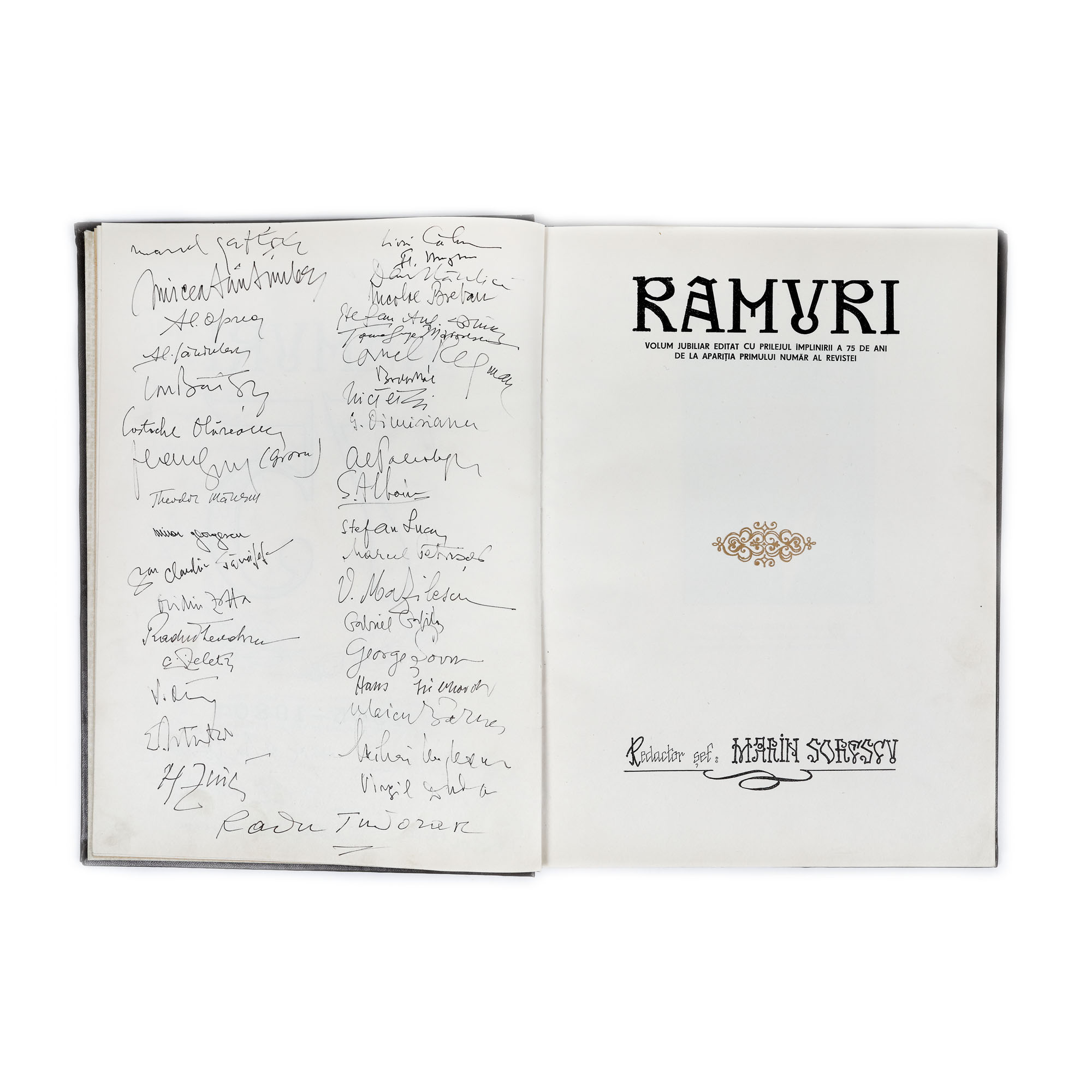 28. ”Ramuri - ediție jubiliară cu prilejul a 75 de ani de la apariția primului număr”, București, 1980, cu semnăturile olografe ale lui Geo Bogza, Nichita Stănescu, Romulus și Ileana Vulpescu, Nina Cassian, Gellu Naum, Edgar Papu, Vasile Băran, George Macovescu, Valeriu Râpeanu etc., piesă de colecție