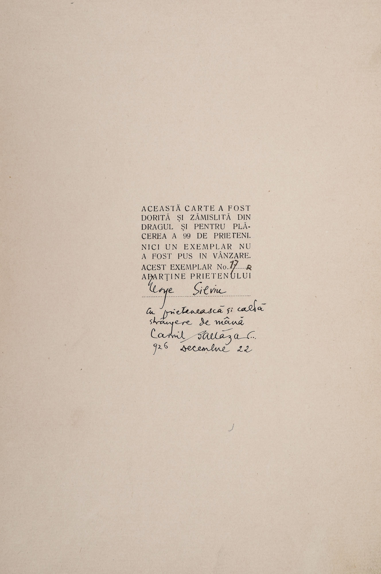 Poetul Camil Baltazar (1902-1977) a dedicat acest volum cu tematică erotică într-un tiraj de doar 99 (exemplar numerotat 17 din 99) de exemplare care nu au fost comercializate, ci dăruite prietenilor și colaboratorilor. Exemplarul poartă dedicația olografă a autorului către prietenul său George Silviu.