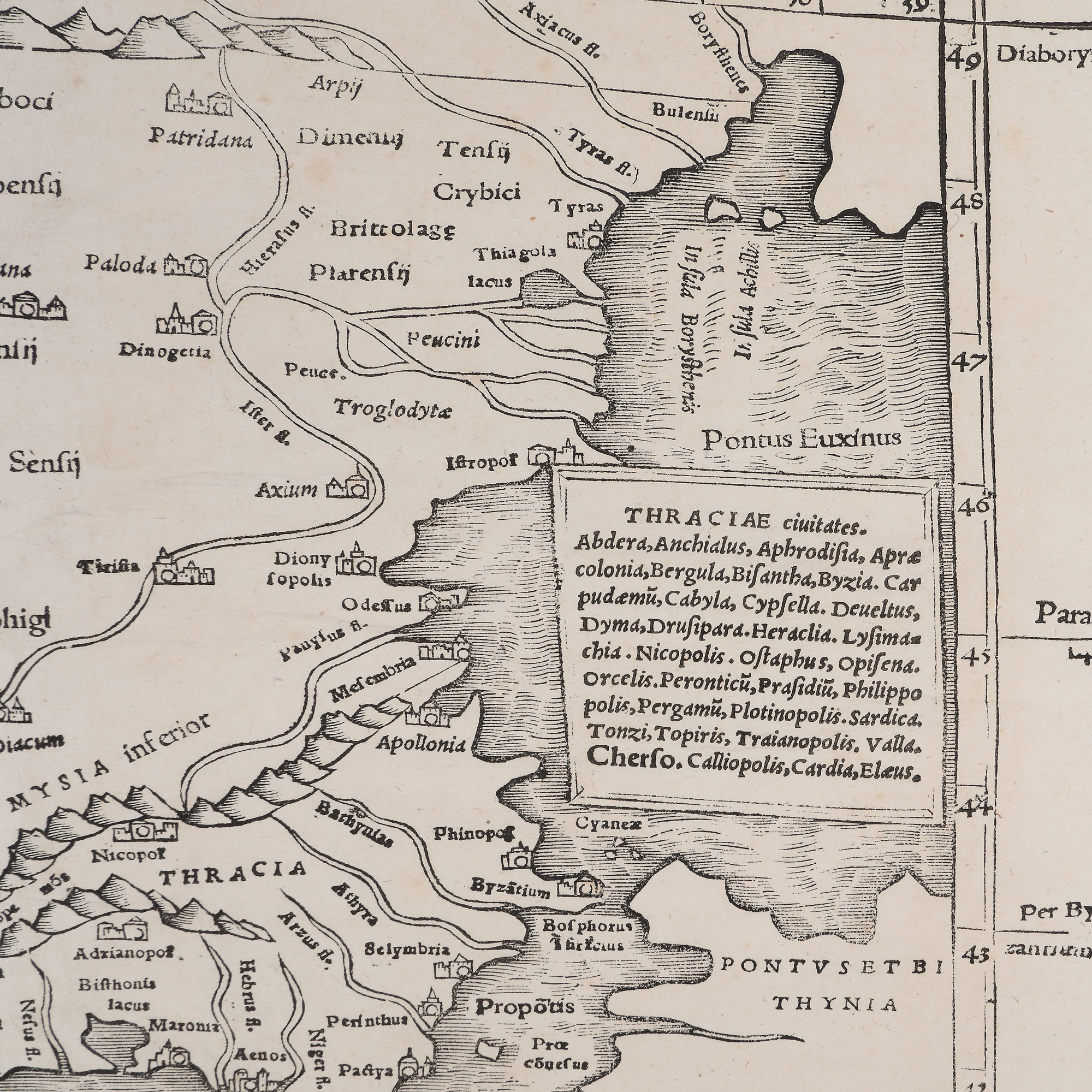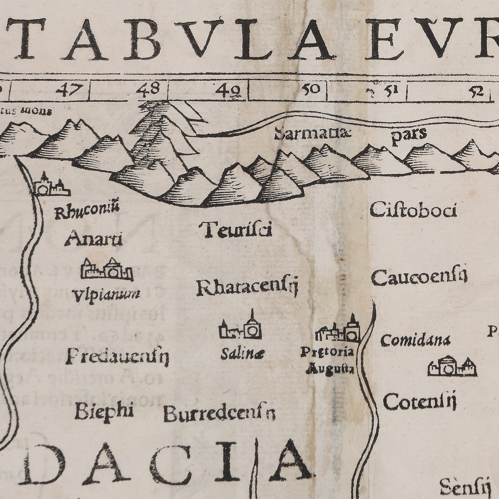 2. Hartă ”Dacia”, de Sebastian Münster, după "Geografia lui Ptolemeu", Basel, cca. 1550, piesă rară, de colecție