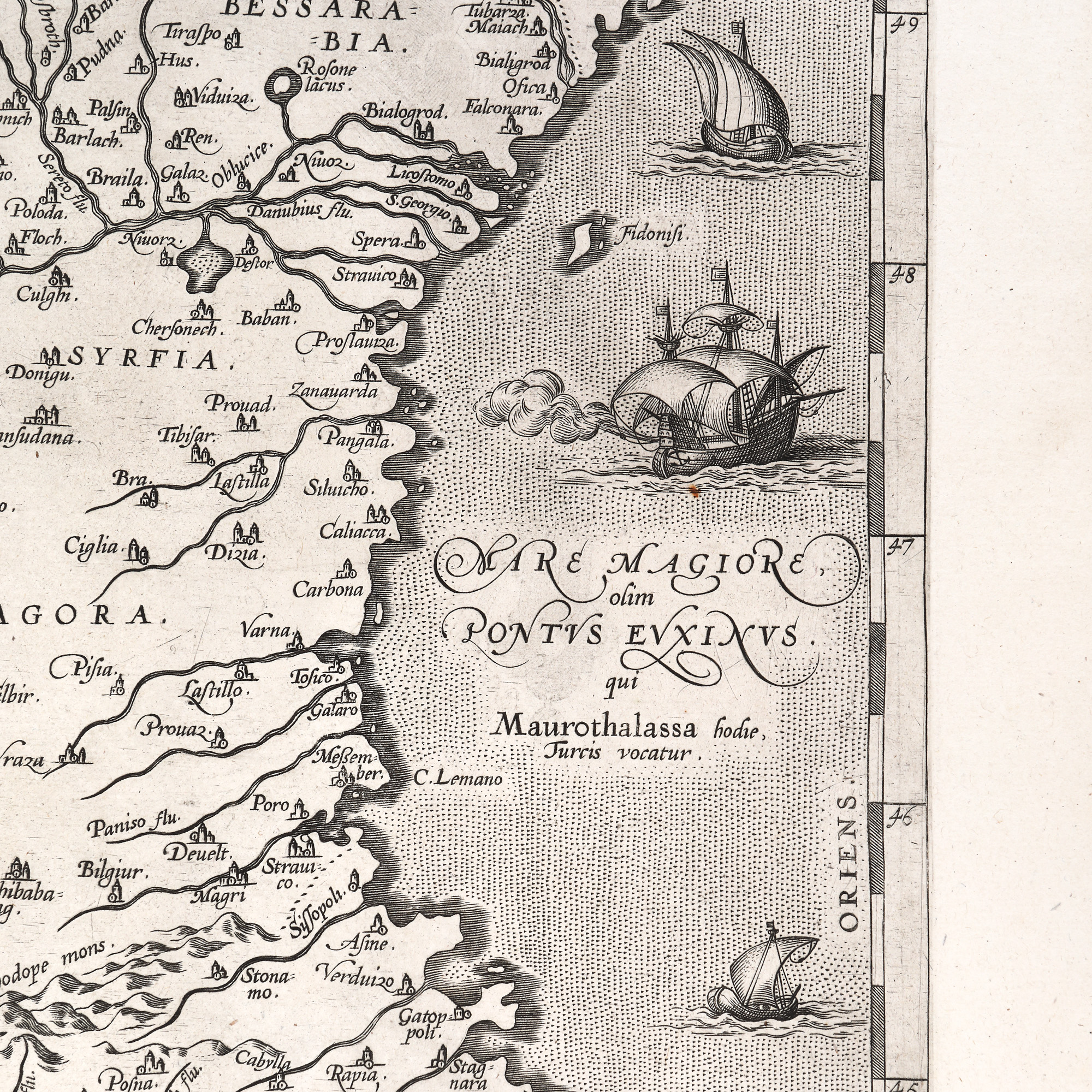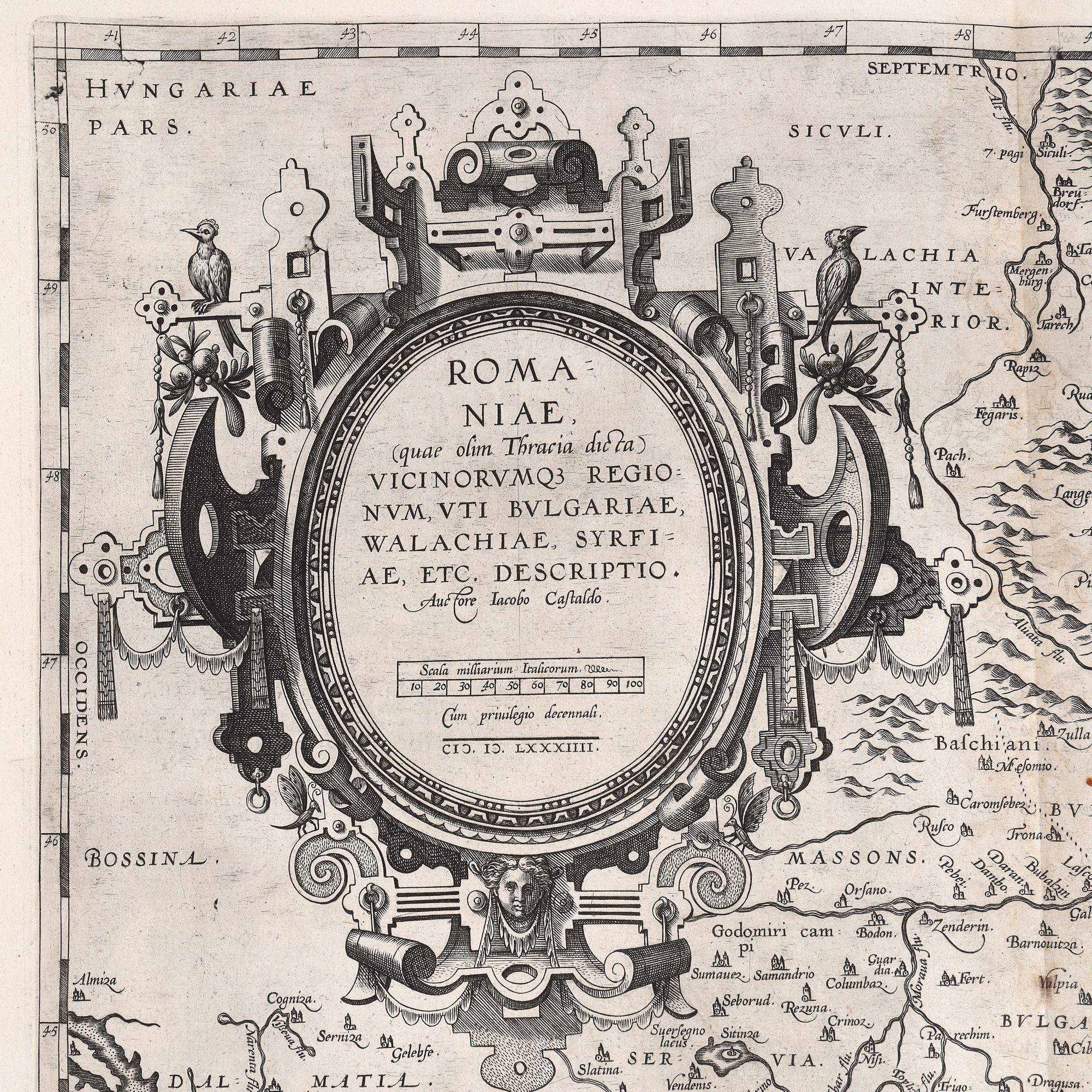 16. Hartă ”Romaniae", de Iacobo Castaldo, tipărită de Abraham Ortelius, ediţia Orbis Terrarum, Antwerp, 1584