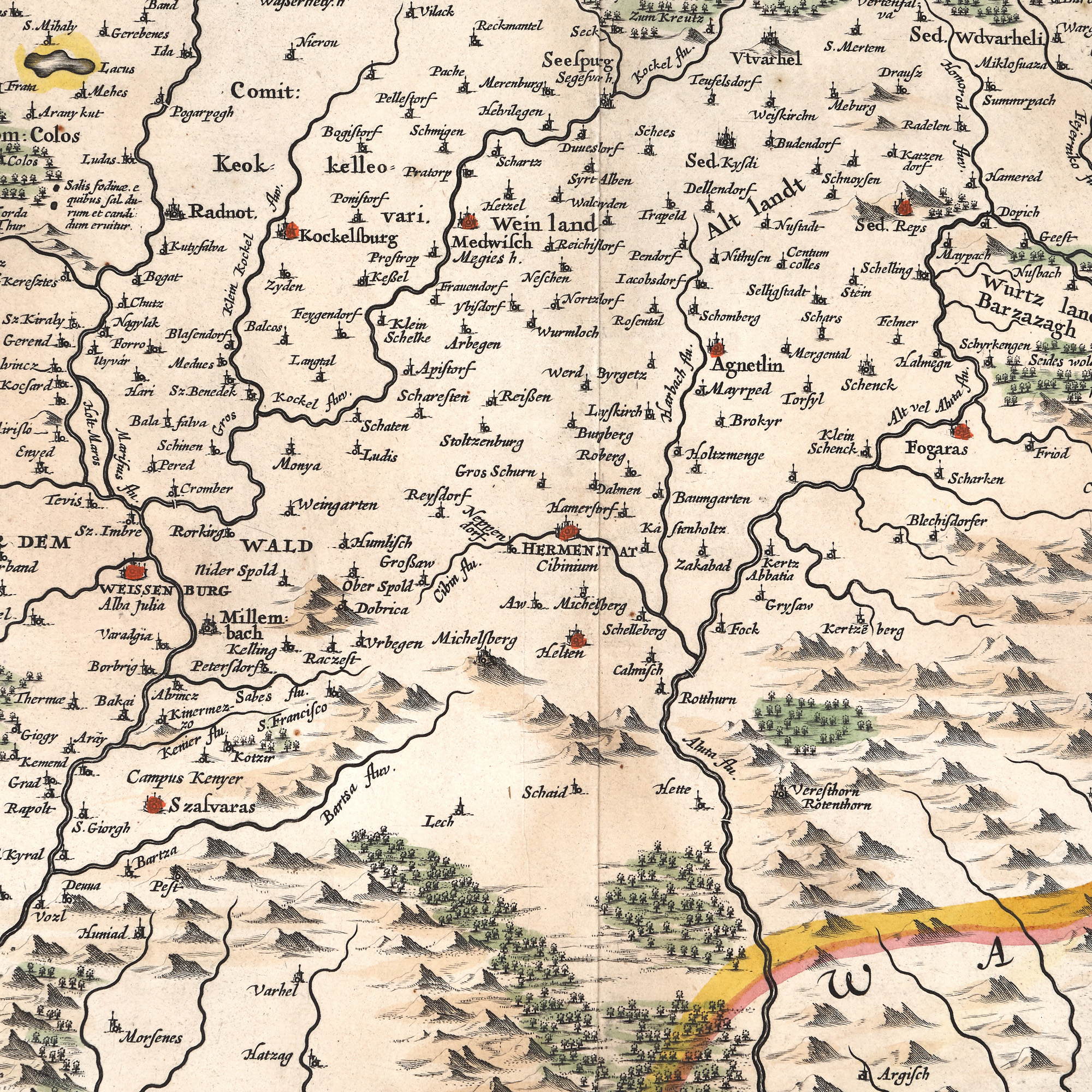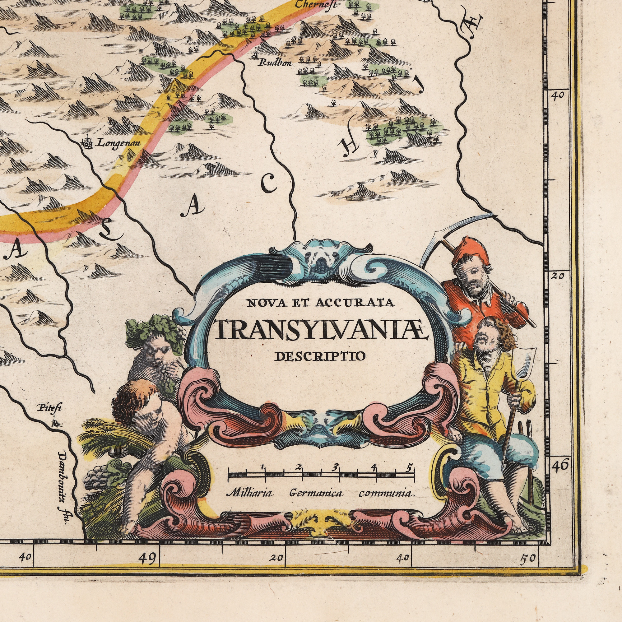 Hartă a Transilvaniei și a regiunilor adiacente (Valahia la sud-est, Moldova și Rusia la nord, și Ungaria la vest), fără indicarea granițelor. Harta prezintă împărțirea Transilvaniei în ținuturi și comitate, și o multitudine de localități, cu denumirile în latină, germană și maghiară: Hermanstat (Sibiu), Fogaraș, Weissenburg/Alba Julia, Clausenburg/Colosvar (Cluj) etc. Lângă numele oraselor importante sunt gravate simboluri miniaturale, cetăți cu turnuri și bastioane. Este menționată și Transalpina, în partea de sud a Munților Carpați. Titlul este prezentat în dreapta jos, într-un cartuș ornamentat cu figuri alegorice simbolizând fertilitatea pământului, și motive vegetale stilizate. În dreapta sus este gravat blazonul familiei Bathory, cu o coroană deasupra. Scara este reprezentată în dreapta jos, în cartuș, în mile germane comune. Harta a fost publicată în Atlas Maior începând cu 1658 și este inspirată de o hartă similară a lui Blaeu.