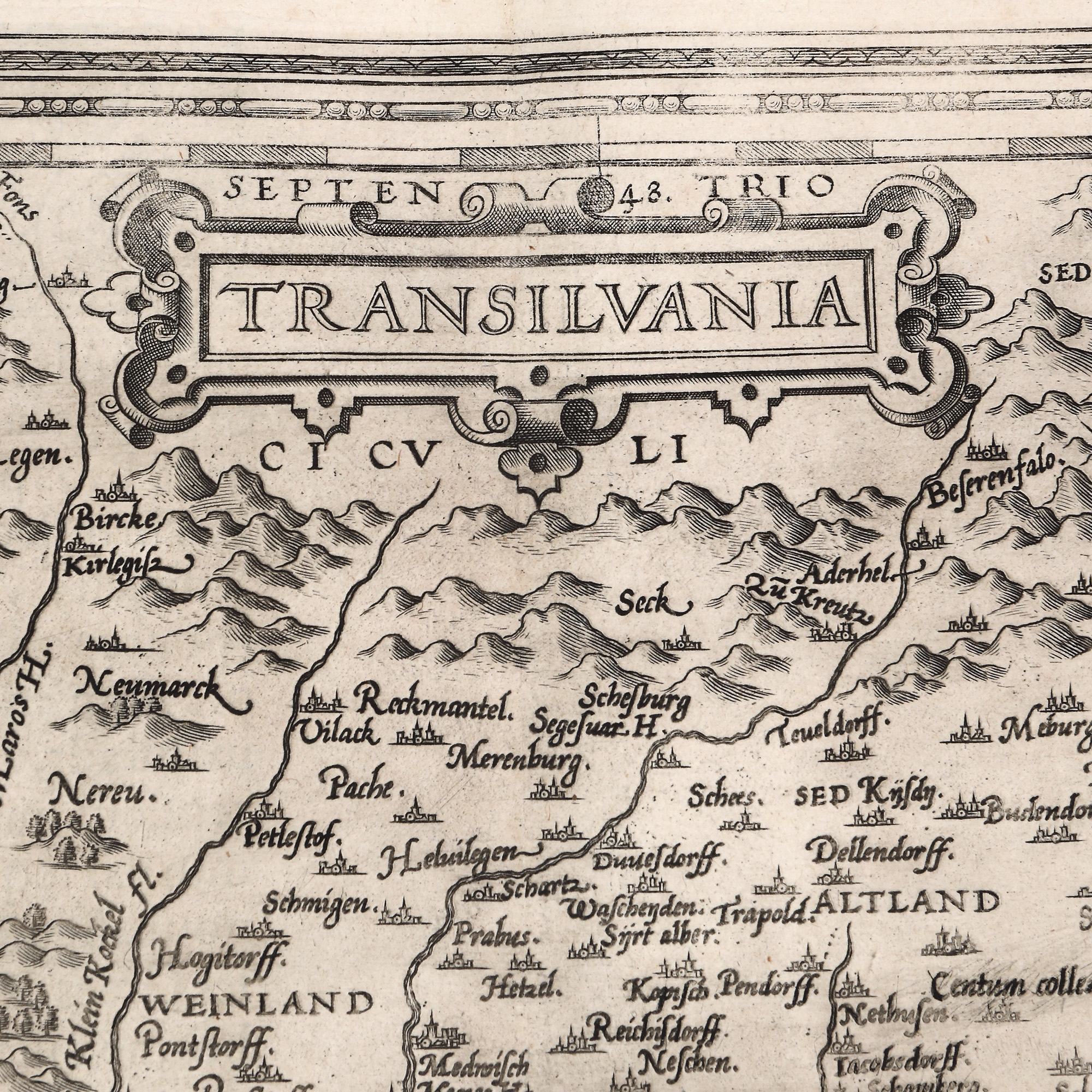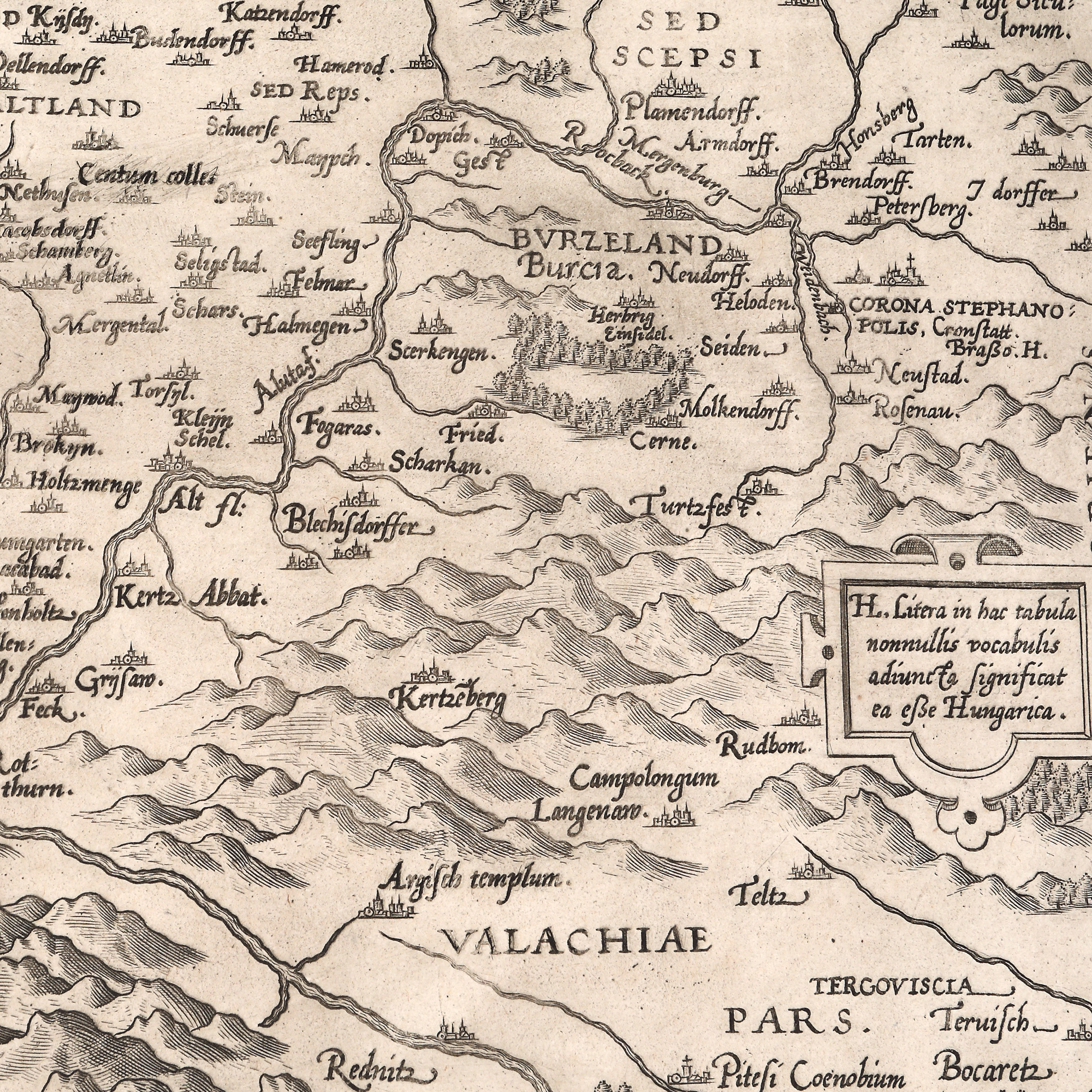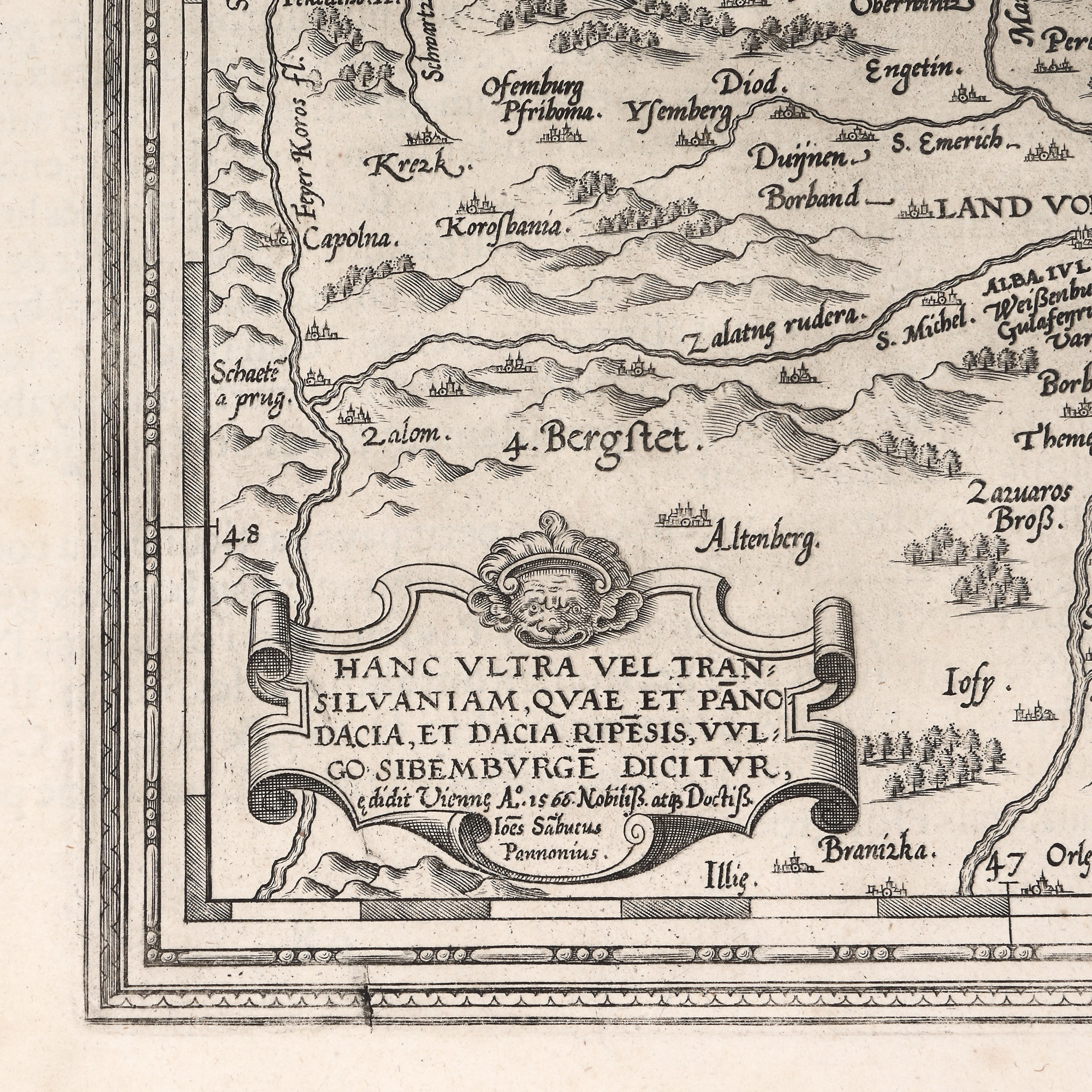 Hartă a Transilvaniei, întocmită de Sambucus după cea a lui Honterus, publicată la Basel în anul 1532. Iniţial, Sambucus a tipărit-o la Viena în anul 1566, după care Ortelius a introdus-o în cunoscutul său Atlas. Din cauza deteriorării primei plăci de aramă, a fost confecţionată o placă nouă, căreia i s-a schimbat parţial înfăţişarea, iar cea de faţă a fost introdusă în atlas începând cu anul 1575. Mai este cunoscută şi ca harta cu patru rânduri, cea veche având cinci rânduri în cartuşul din partea dreaptă. Pe verso este tipărit un text privind istoria Transilvaniei şi o listă de localităţi în limba germană, latină şi maghiară, întocmită de Ortelius însuşi.