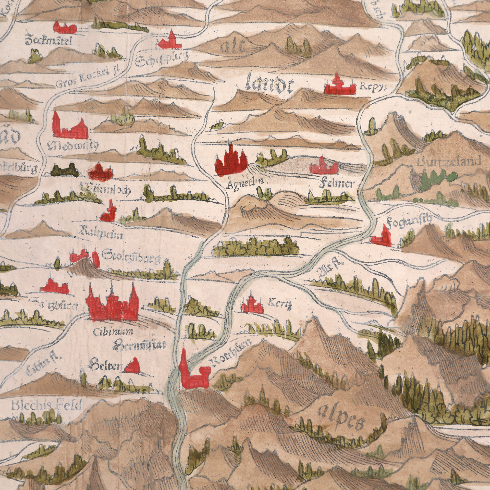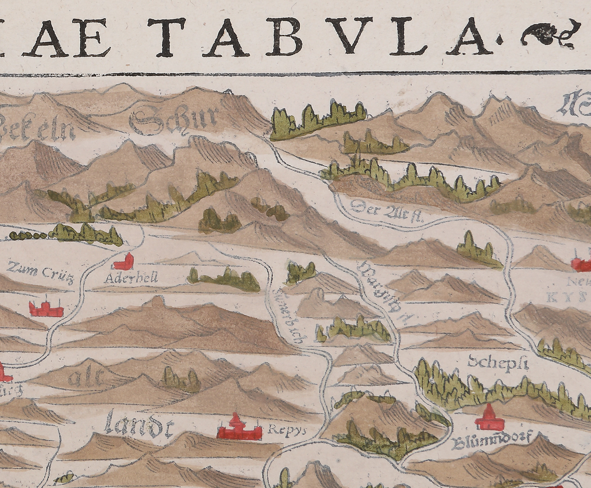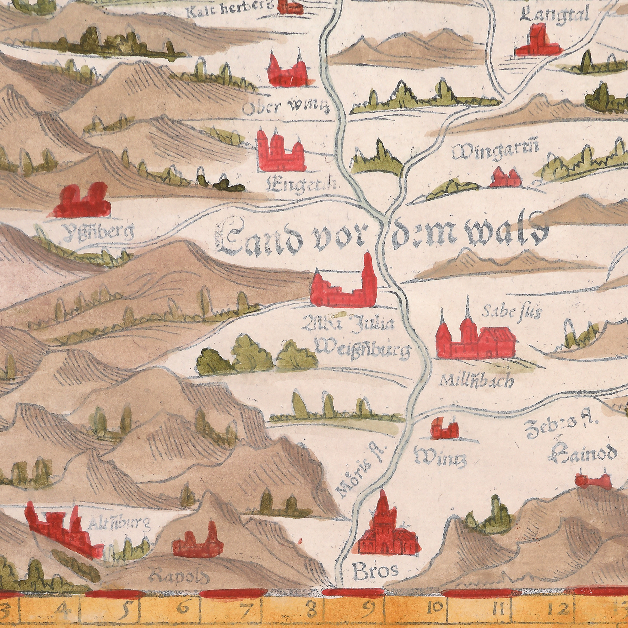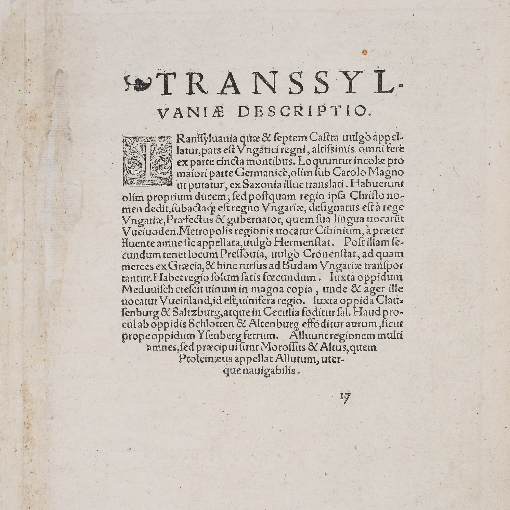 Hartă a Transilvaniei și a regiunilor adiacente, inspirată de lucrarea umanistului sas Johannes Honterus din 1532. Începând cu 1544 a fost publicată în ”Cosmographia Universalis” și editată în numeroase ediții. Această hartă în limba germană face parte dintr-o ediție publicată după 1572. În dreapta sus este pozitionată Moldaw, în partea de jos Hatzeck Walachien, iar în registrul inferior, în partea dreaptă, este mentionată Bulgarien. Alăturarea Hațegului și a Valachiei se poate explica prin criterii etnice. Teritoriul Transilvaniei este reprezentat în interiorul lanțului carpatic și este împărțit în cinci țări/ținuturi menționate în limba germană: Winlad, Altlandt (Țara Veche), Burtzeland (Țara Bârsei), Land vor dem Wald (Țara de dinaintea Pădurii) și Zekeln Schur. Nu sunt trasate granițele externe cu țările învecinate și nici cele dintre regiunile componente. Sunt menționate localitățile Alba lulia/Weisnburg, Bras, Sabesus, Millnbach, Hermanstat, Cibinum, Rotthurn (Turnu Roșu), Fogaristh, Agnetlin, Felmer, Repys Terz, Rosenow, Cronstat (Brasov), Neumarck/Kysai, multe dintre acestea marcate cu cetăți miniaturale.